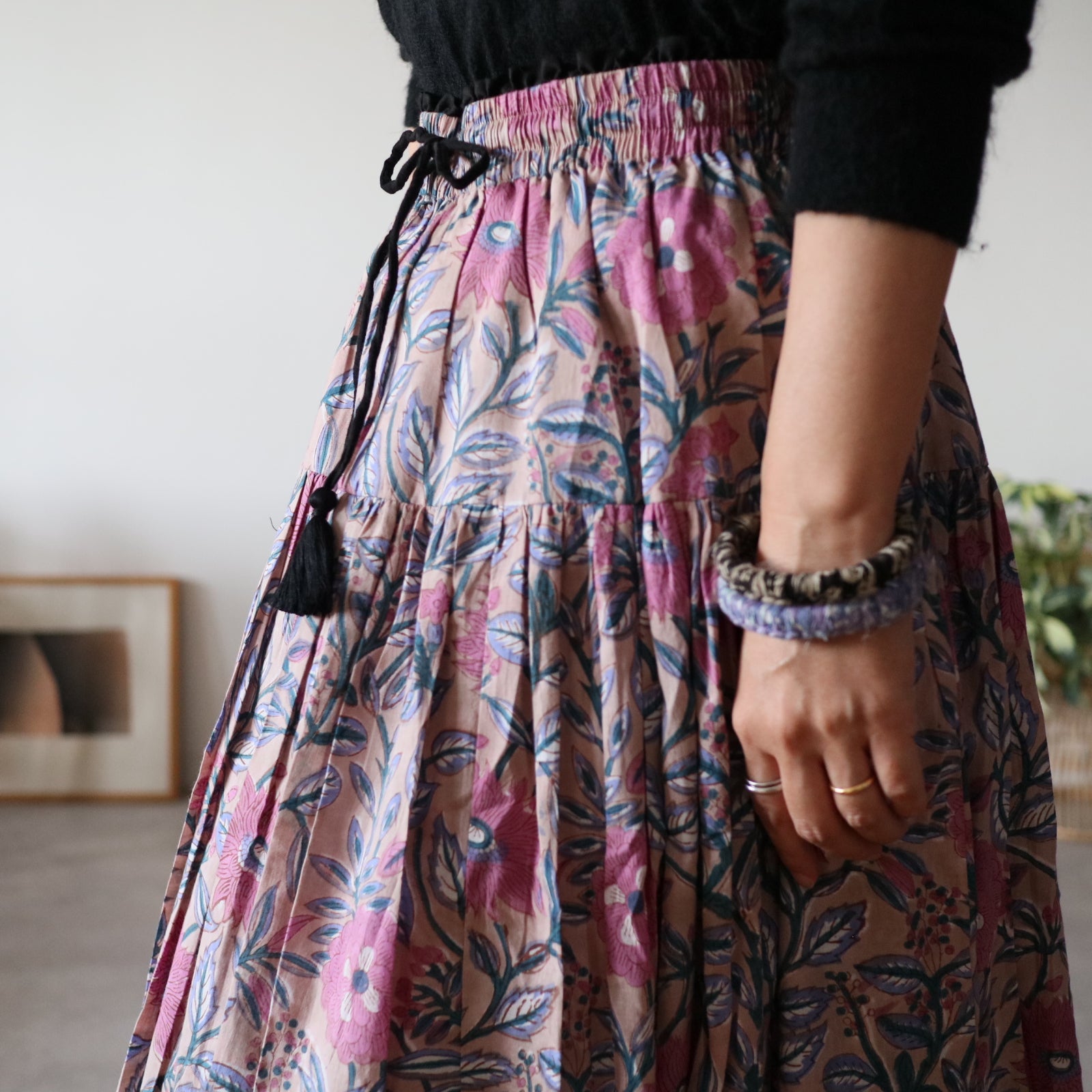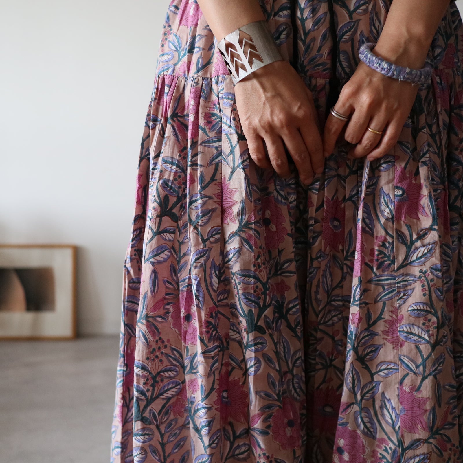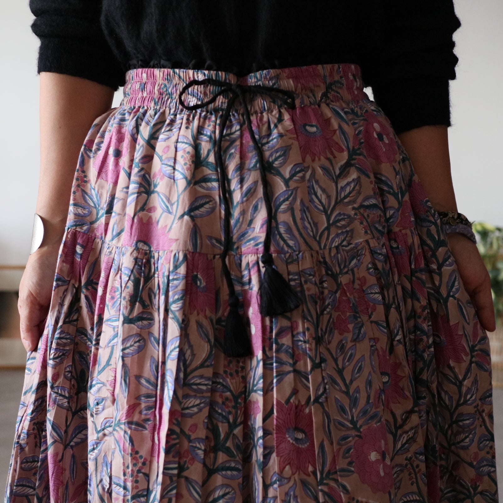 人気商品"ジャムダニスカート"のデザインはそのままにブロックプリント生地に合うよう生地量を調整し、広がり過ぎずにスッキリ。でも華やかさがある。そんなティアードスカートを作りました。