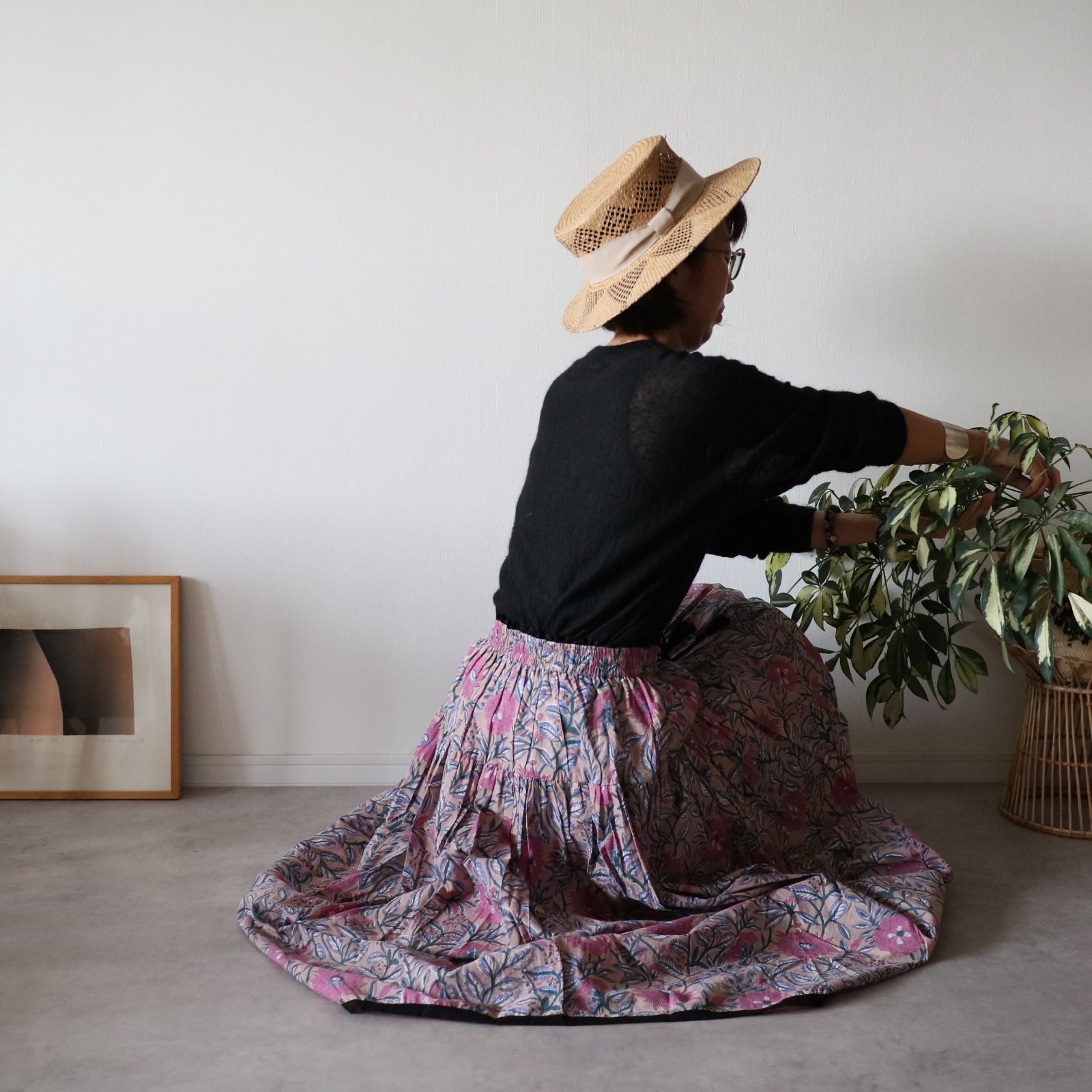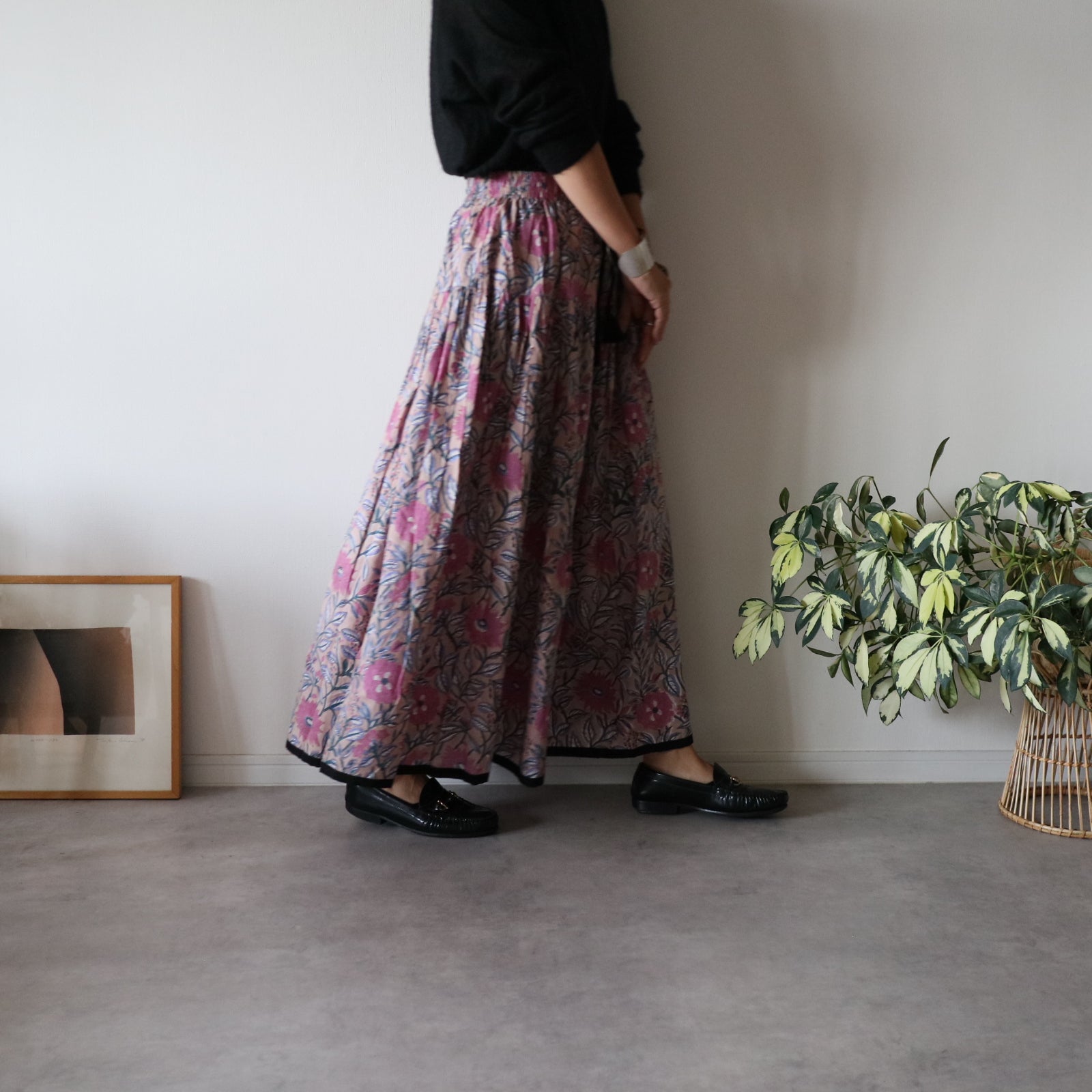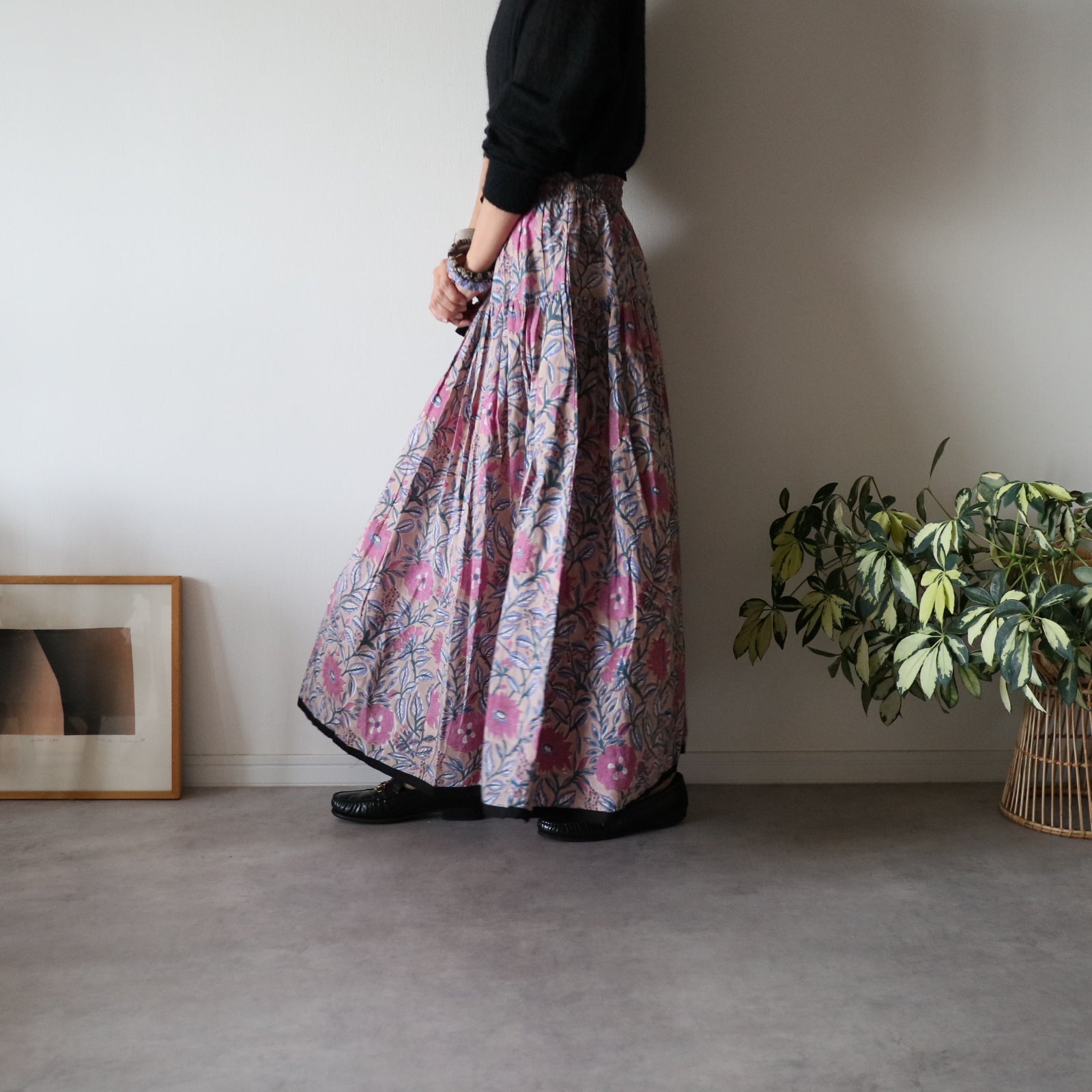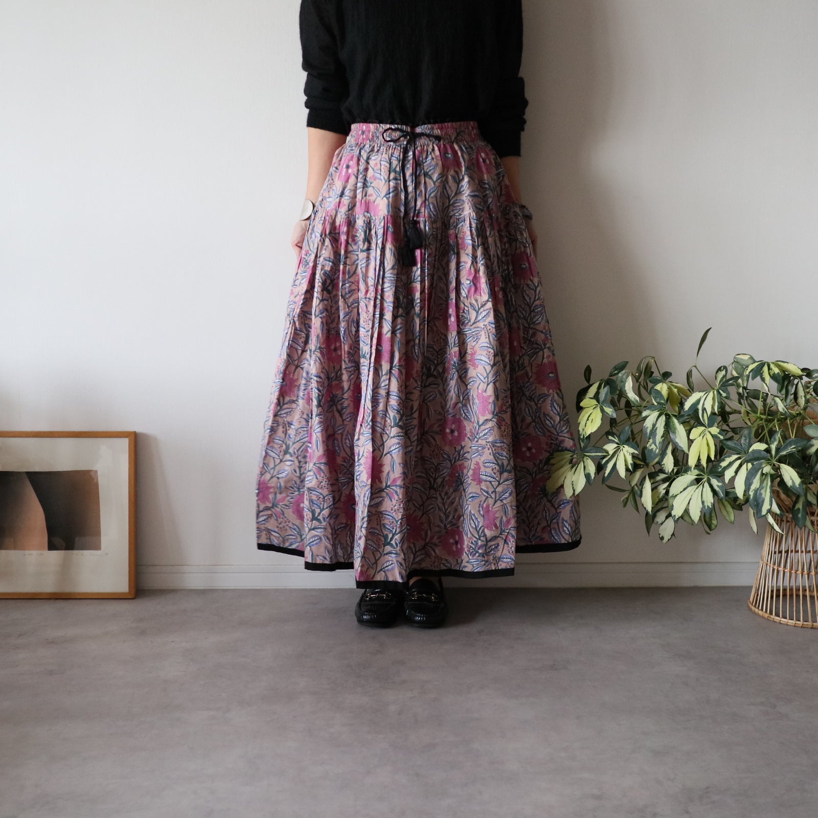 人気商品"ジャムダニスカート"のデザインはそのままにブロックプリント生地に合うよう生地量を調整し、広がり過ぎずにスッキリ。でも華やかさがある。そんなティアードスカートを作りました。