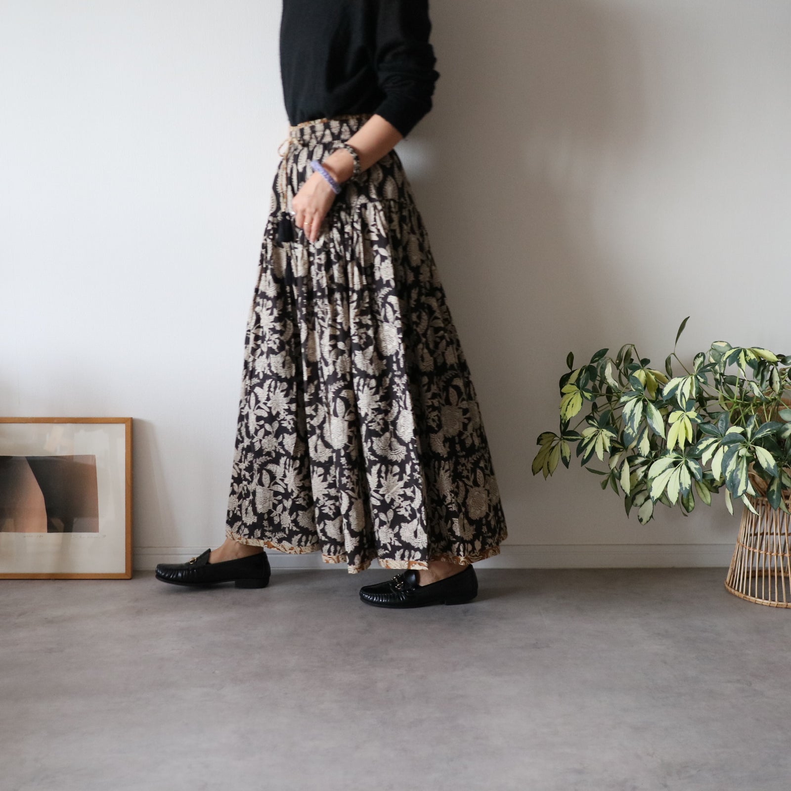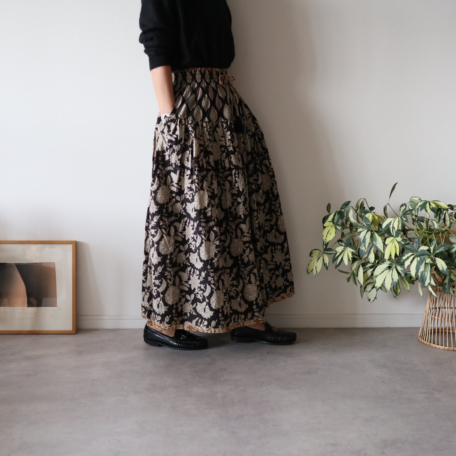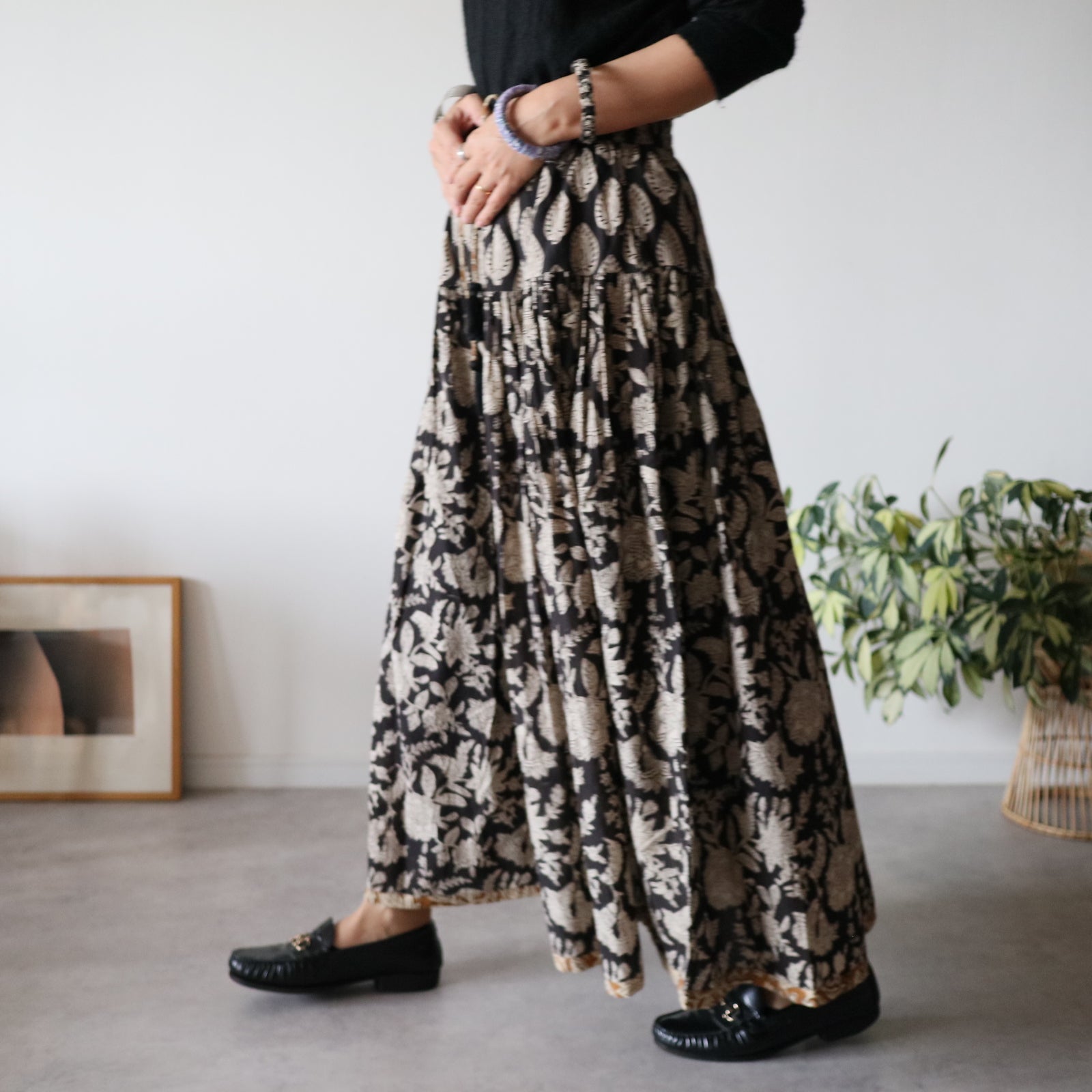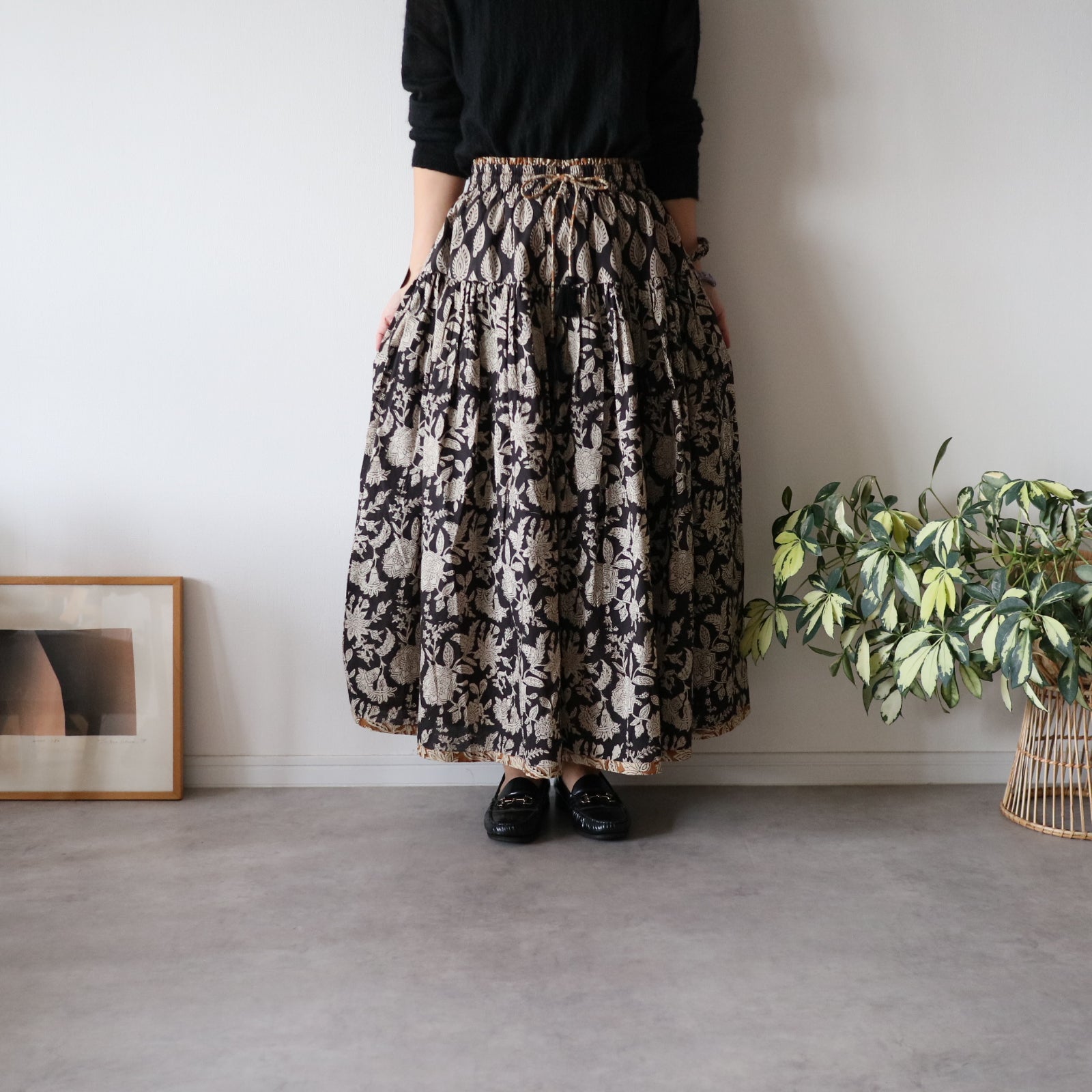 しなやかボリュームのティアードスカート -black×brown flower-