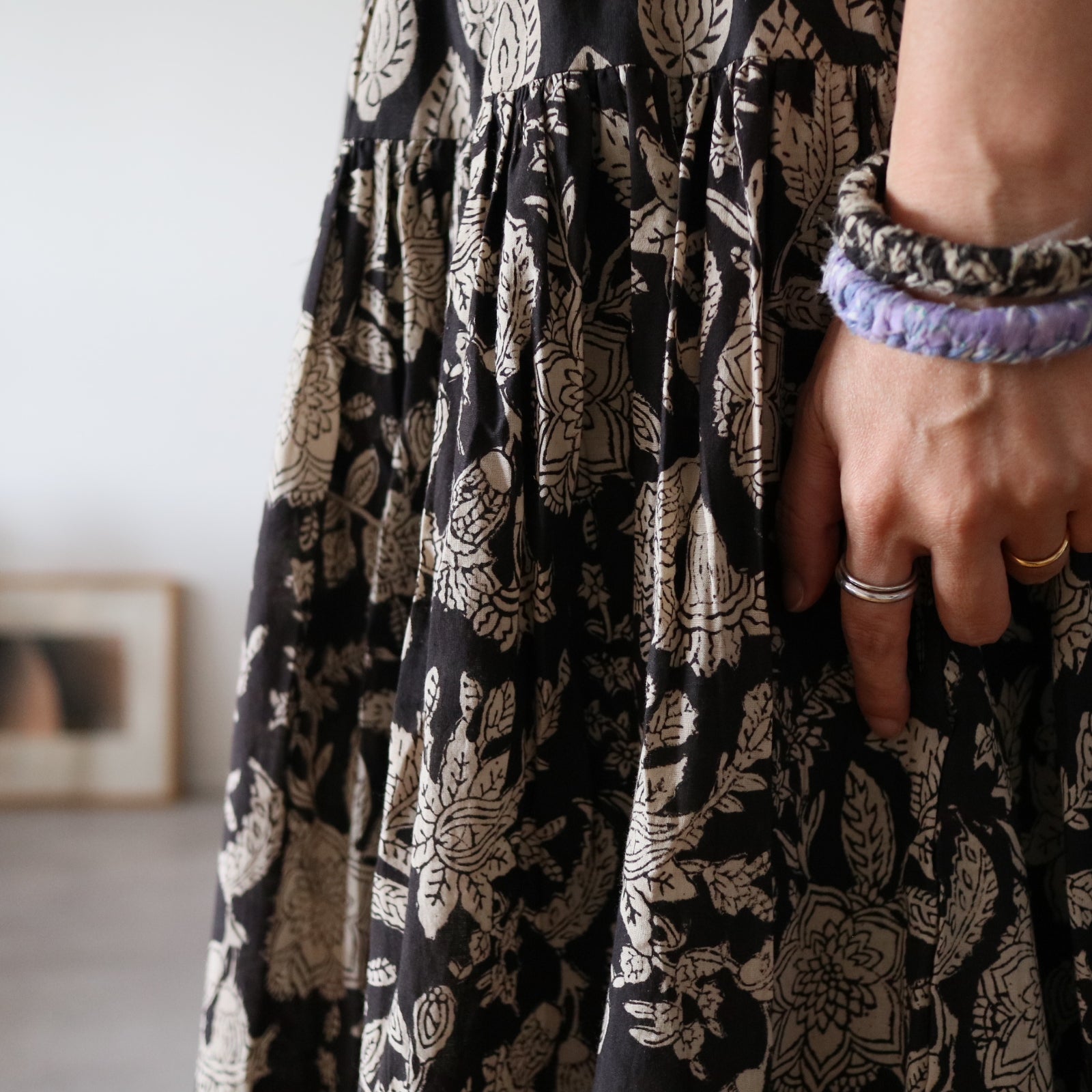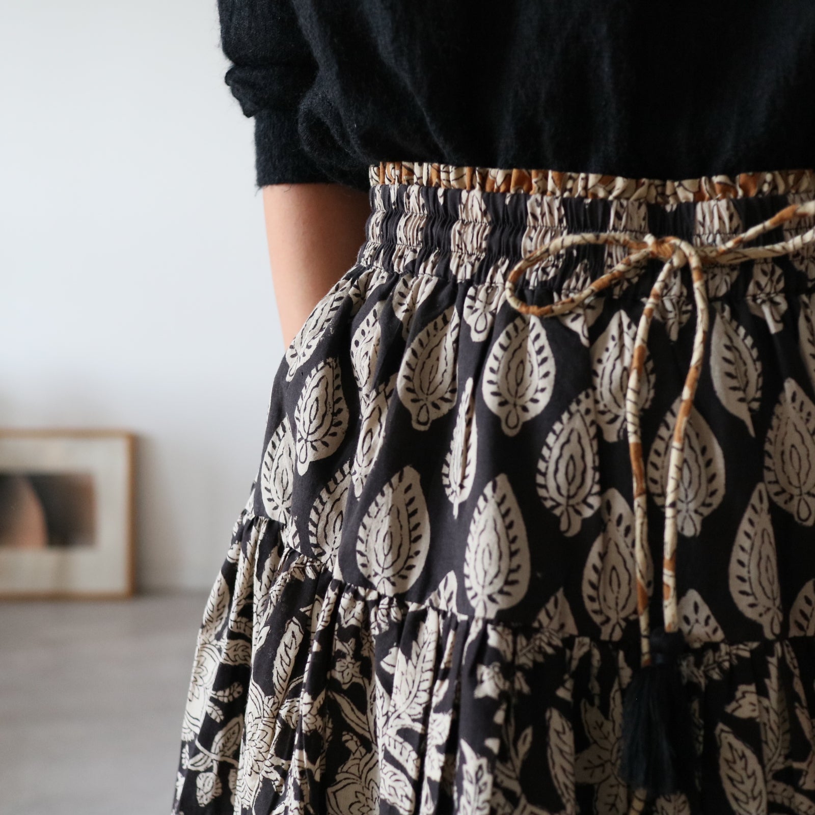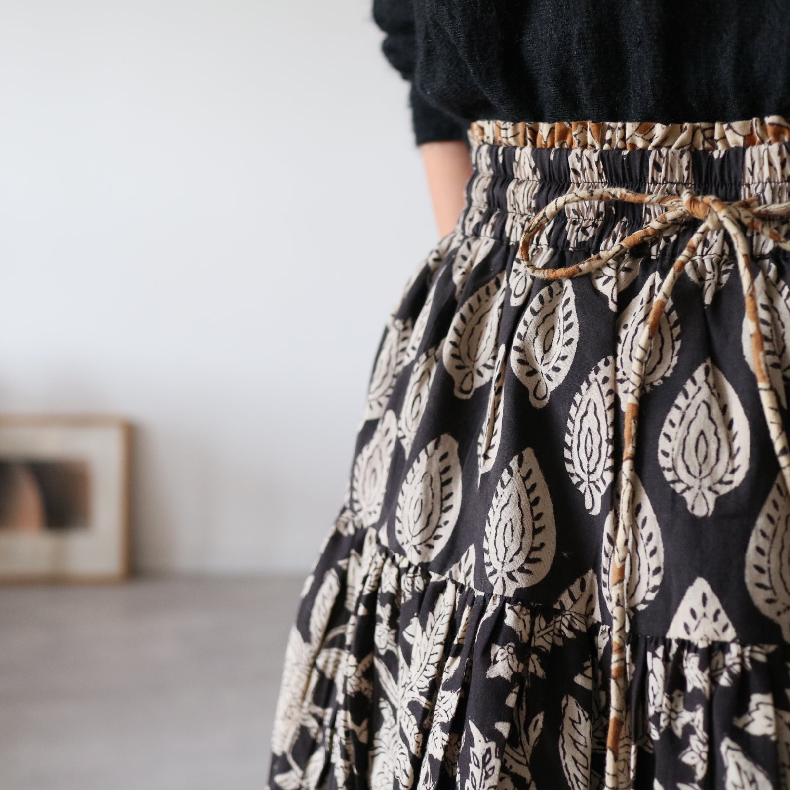 人気商品"ジャムダニスカート"のデザインはそのままにブロックプリント生地に合うよう生地量を調整し、広がり過ぎずにスッキリ。でも華やかさがある。そんなティアードスカートを作りました。