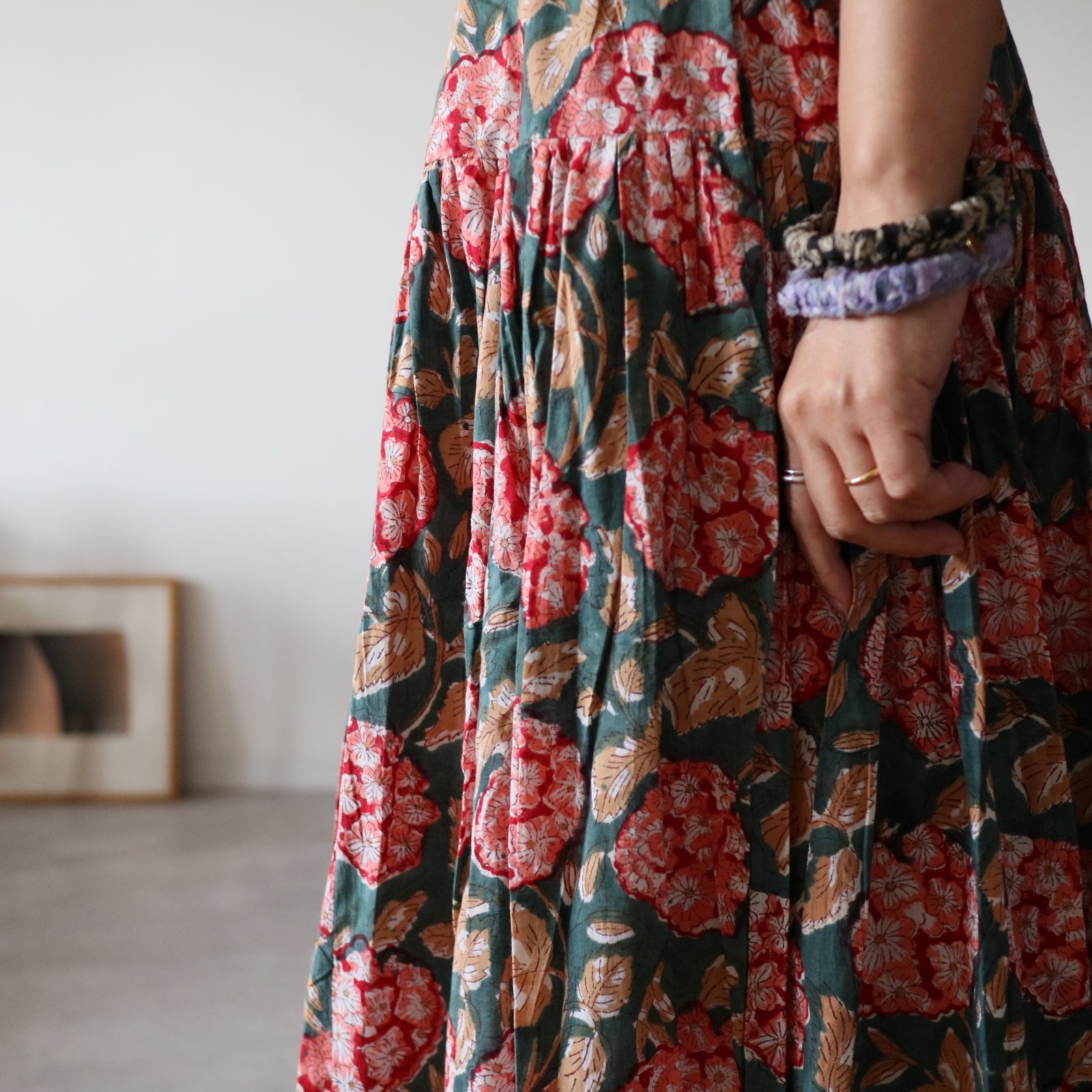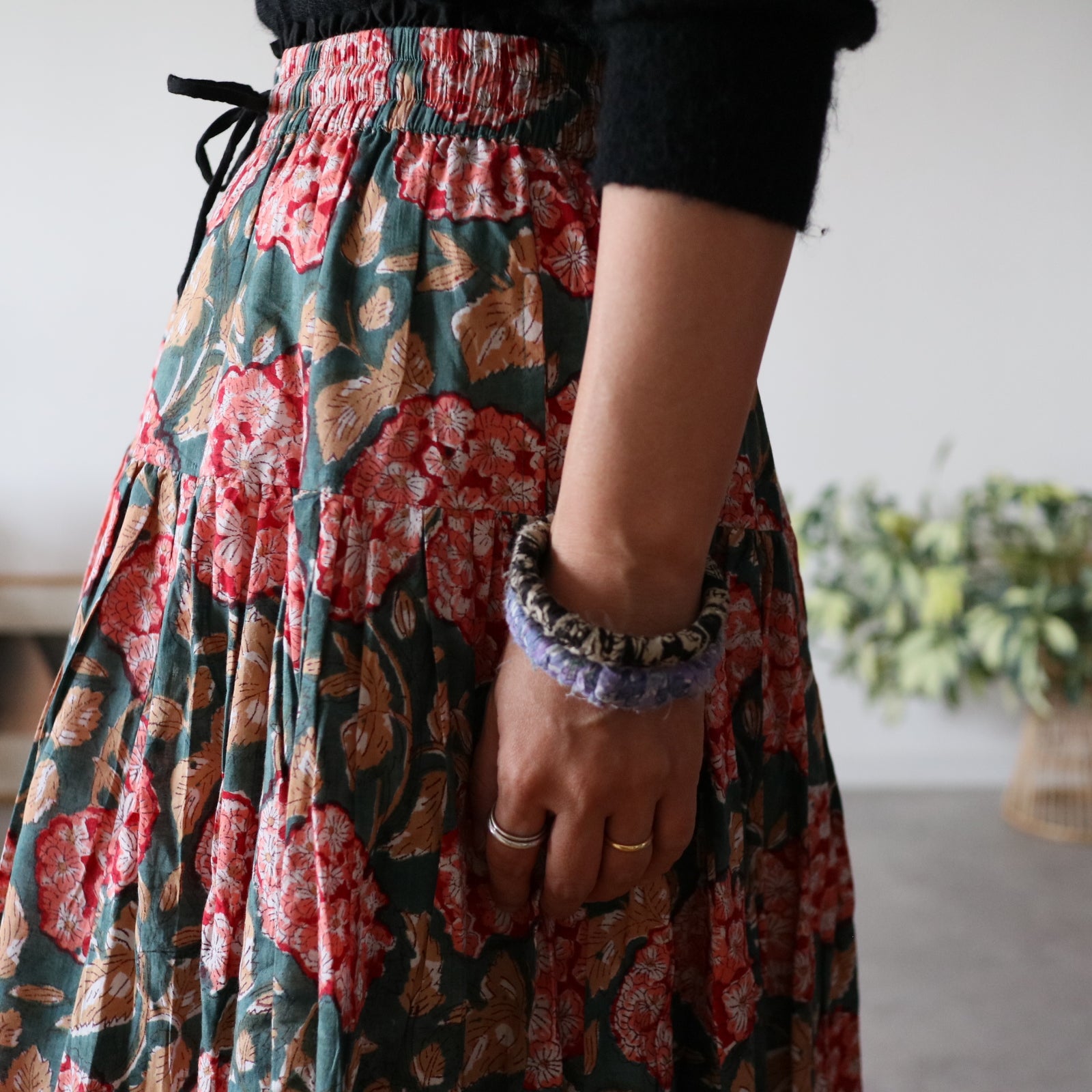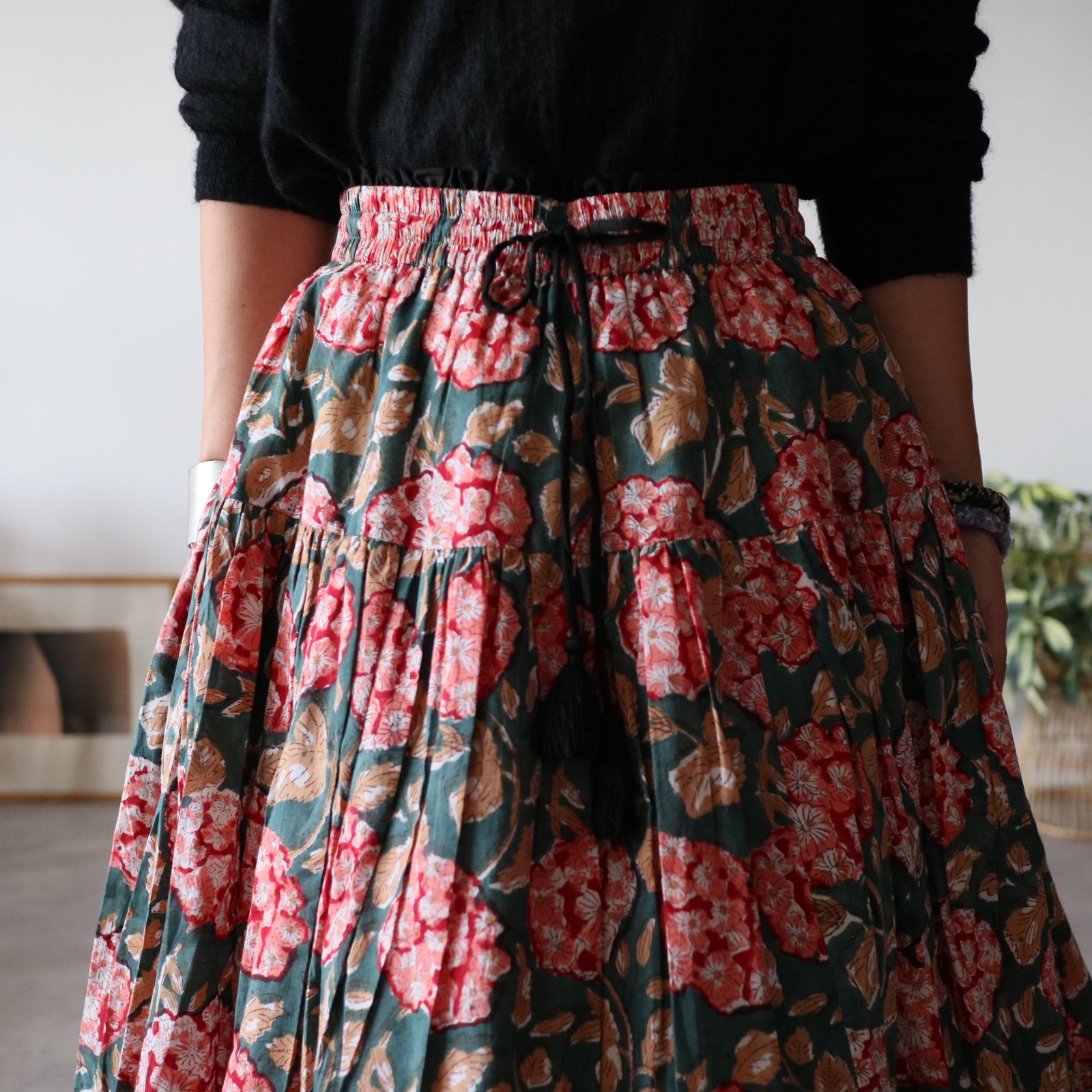人気商品"ジャムダニスカート"のデザインはそのままにブロックプリント生地に合うよう生地量を調整し、広がり過ぎずにスッキリ。でも華やかさがある。そんなティアードスカートを作りました。