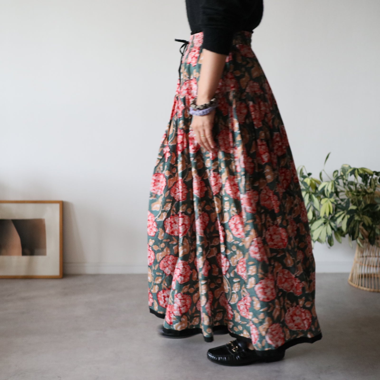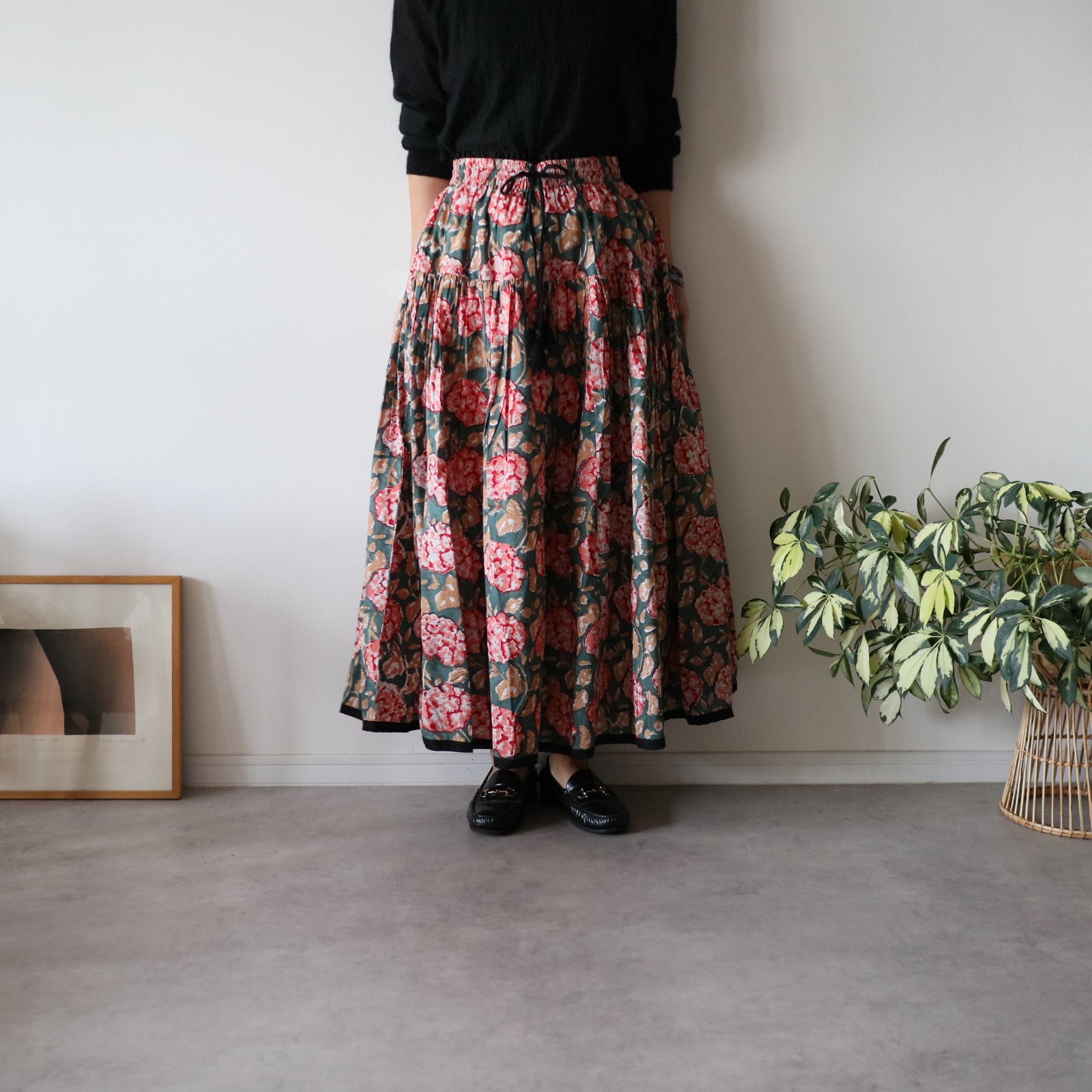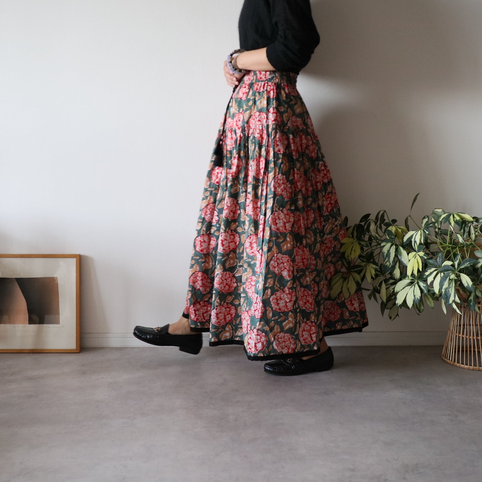 人気商品"ジャムダニスカート"のデザインはそのままにブロックプリント生地に合うよう生地量を調整し、広がり過ぎずにスッキリ。でも華やかさがある。そんなティアードスカートを作りました。