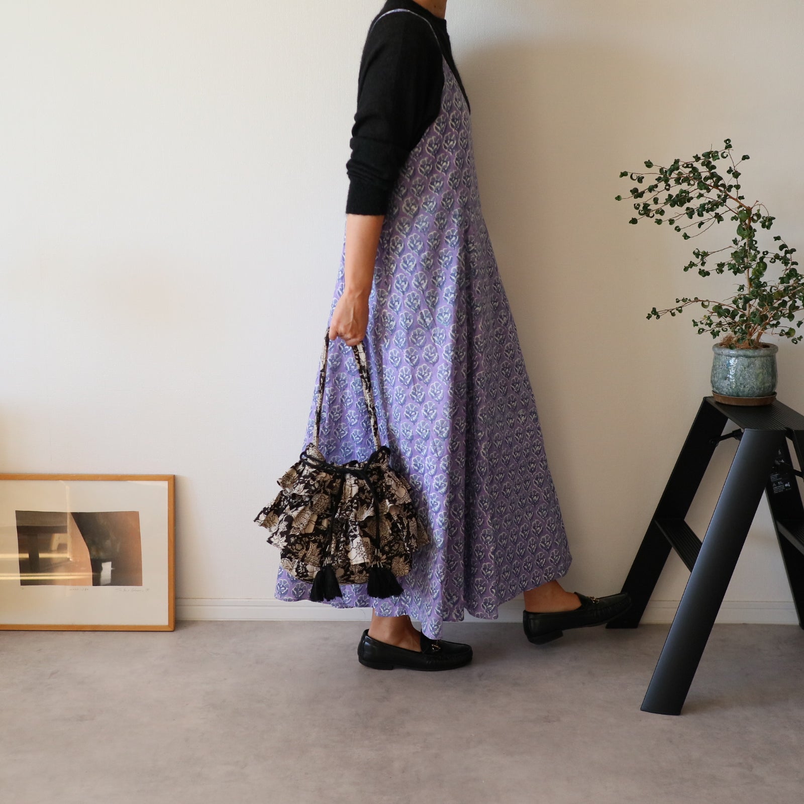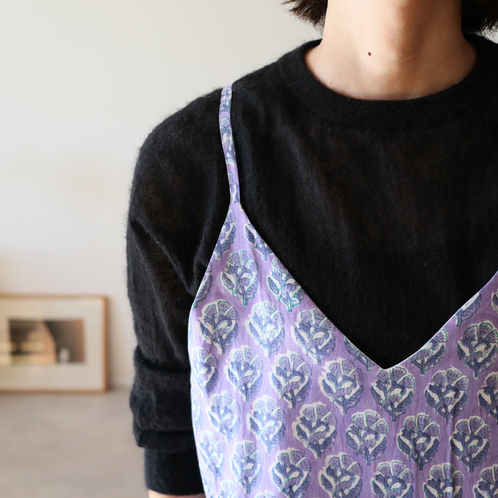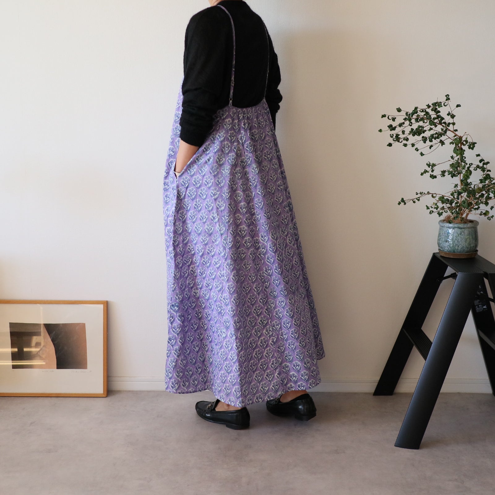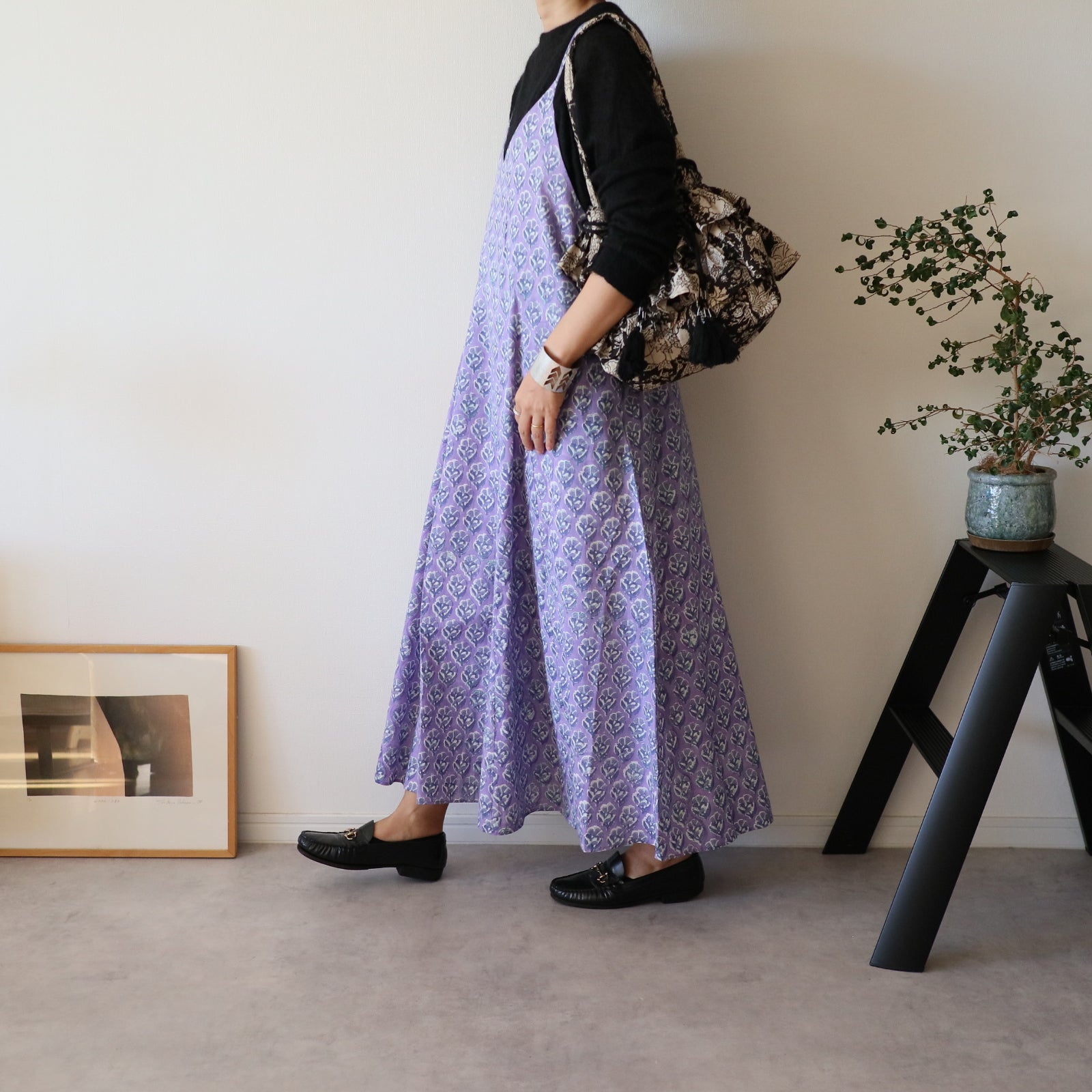 繊細なインドのブロックプリントで仕立てた、心地よさと華やかさを両立するキャミソールワンピース。上半身スッキリ、スカートは広がり過ぎないフレアタイプ。