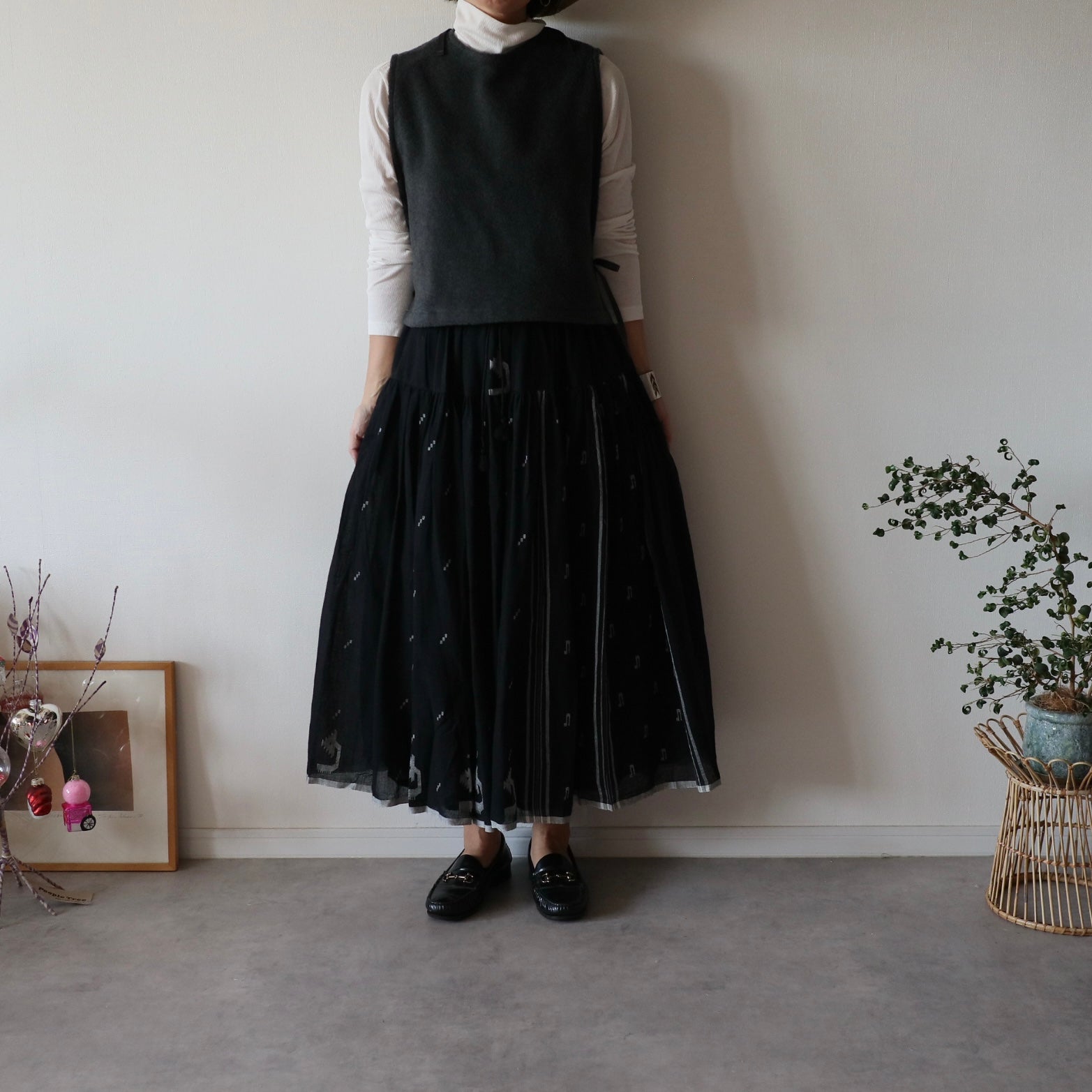 ジャムダニ織は職人さんが驚くほど細い糸で模様を1針1針織り込みながら生地にしていきます。糸のほつれや飛び出し、織りむら、ネップの強い箇所がありますが、それは糸のつむぎ手が途中で変わったり織り手の癖が出るためです。当店のジャムダニ織はスカートは裾とウエストの端はデザインを生かす為処理をしておりません。この時代に手織りの布を纏うこと。機械では表せない温かみのある模様や360度表情の変わる美しいデザインを是非お楽しみください。