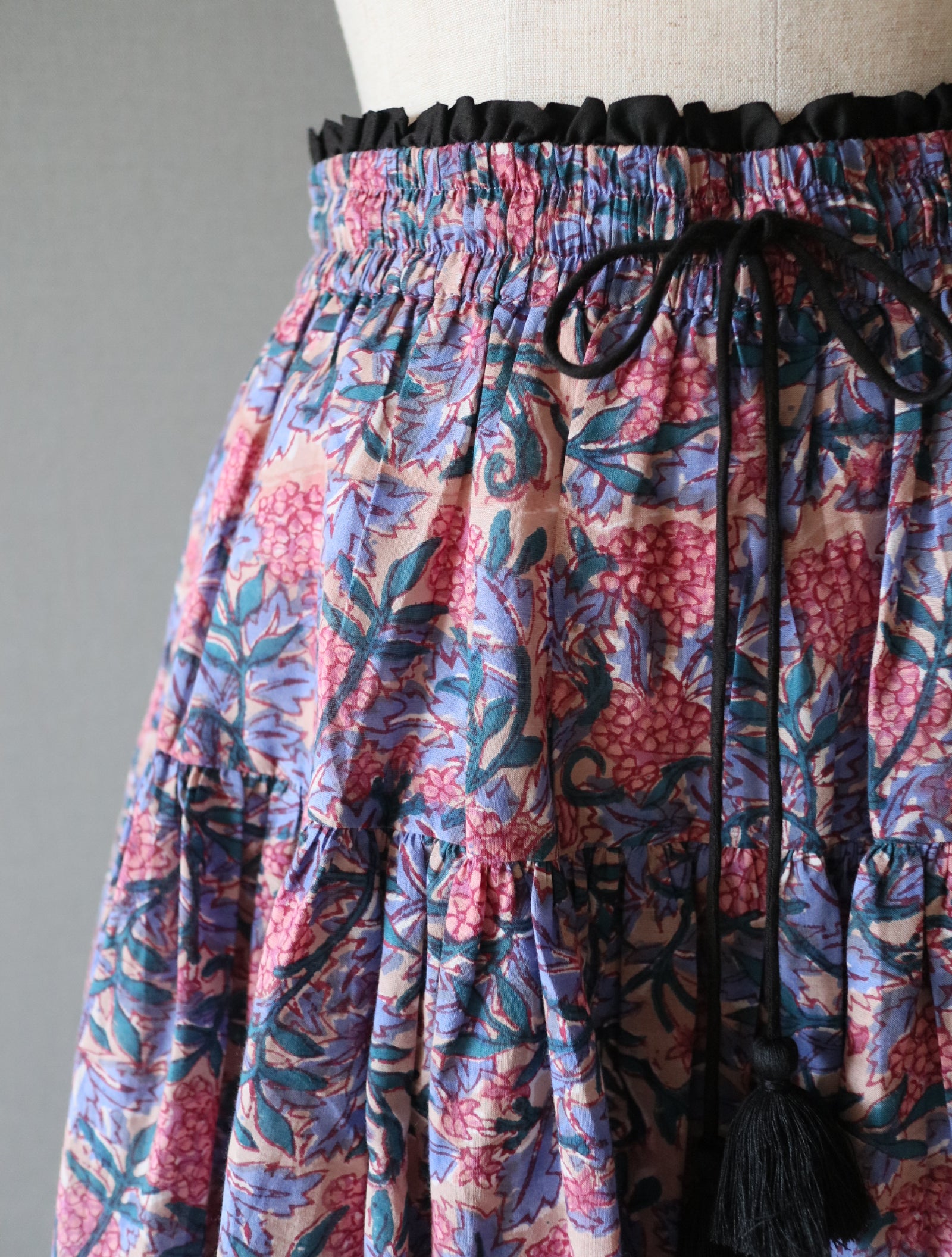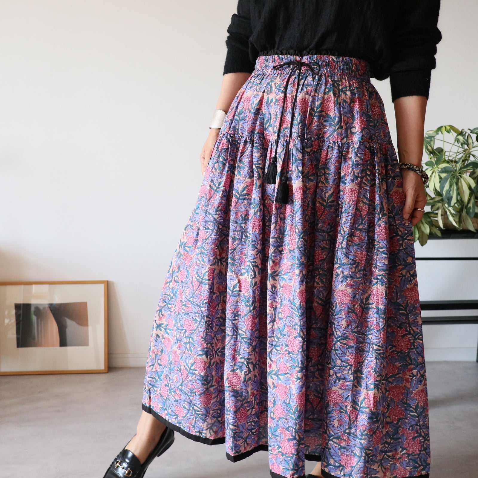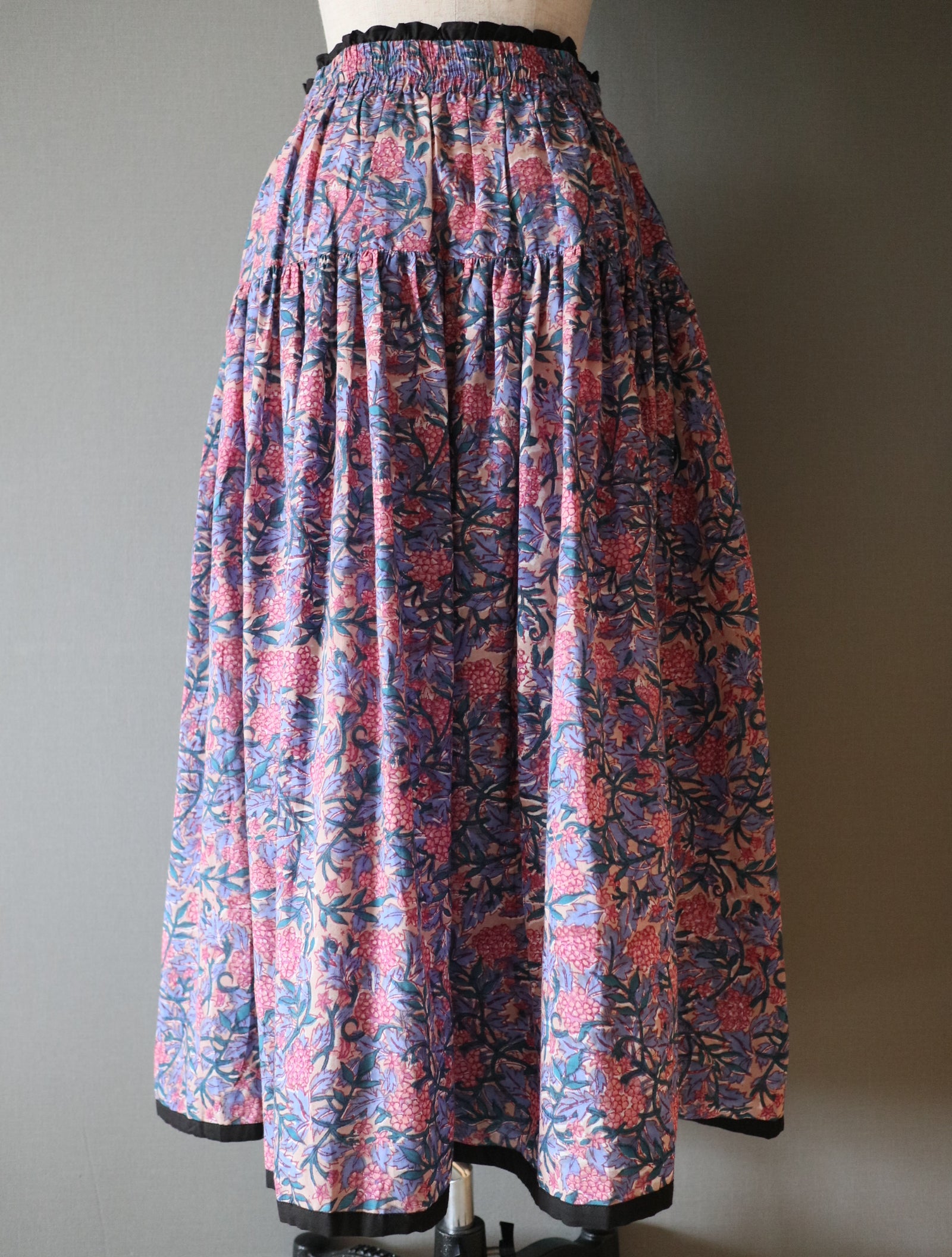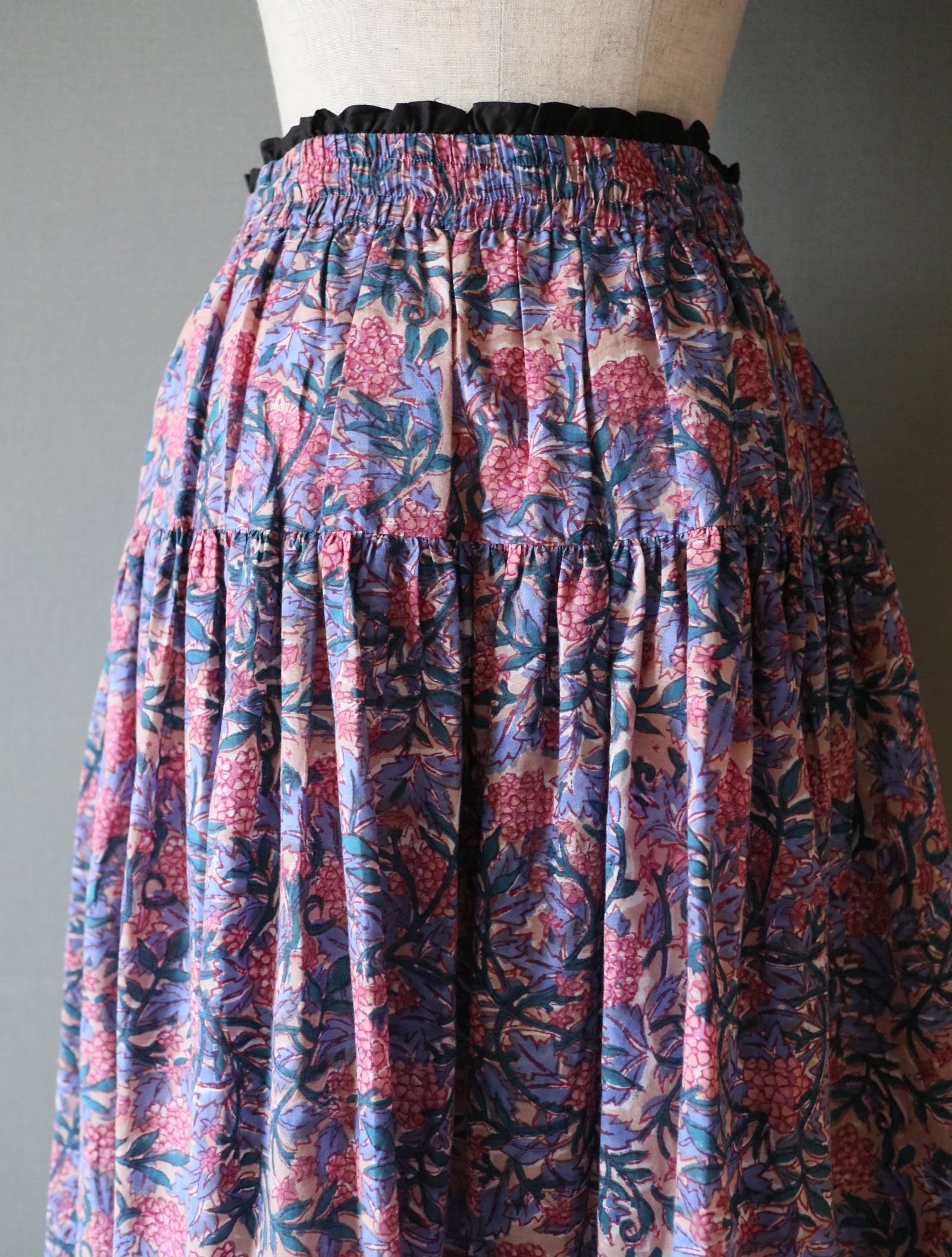 人気商品"ジャムダニスカート"のデザインはそのままにブロックプリント生地に合うよう生地量を調整し、広がり過ぎずにスッキリ。でも華やかさがある。そんなティアードスカートを作りました。