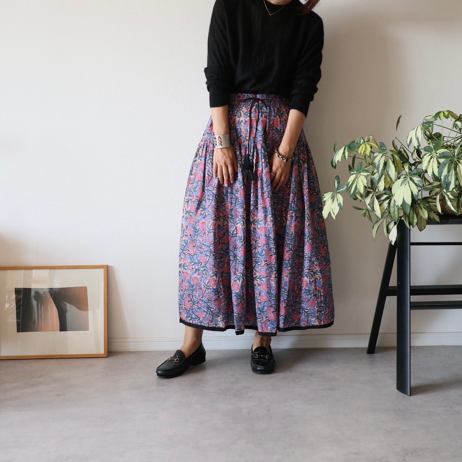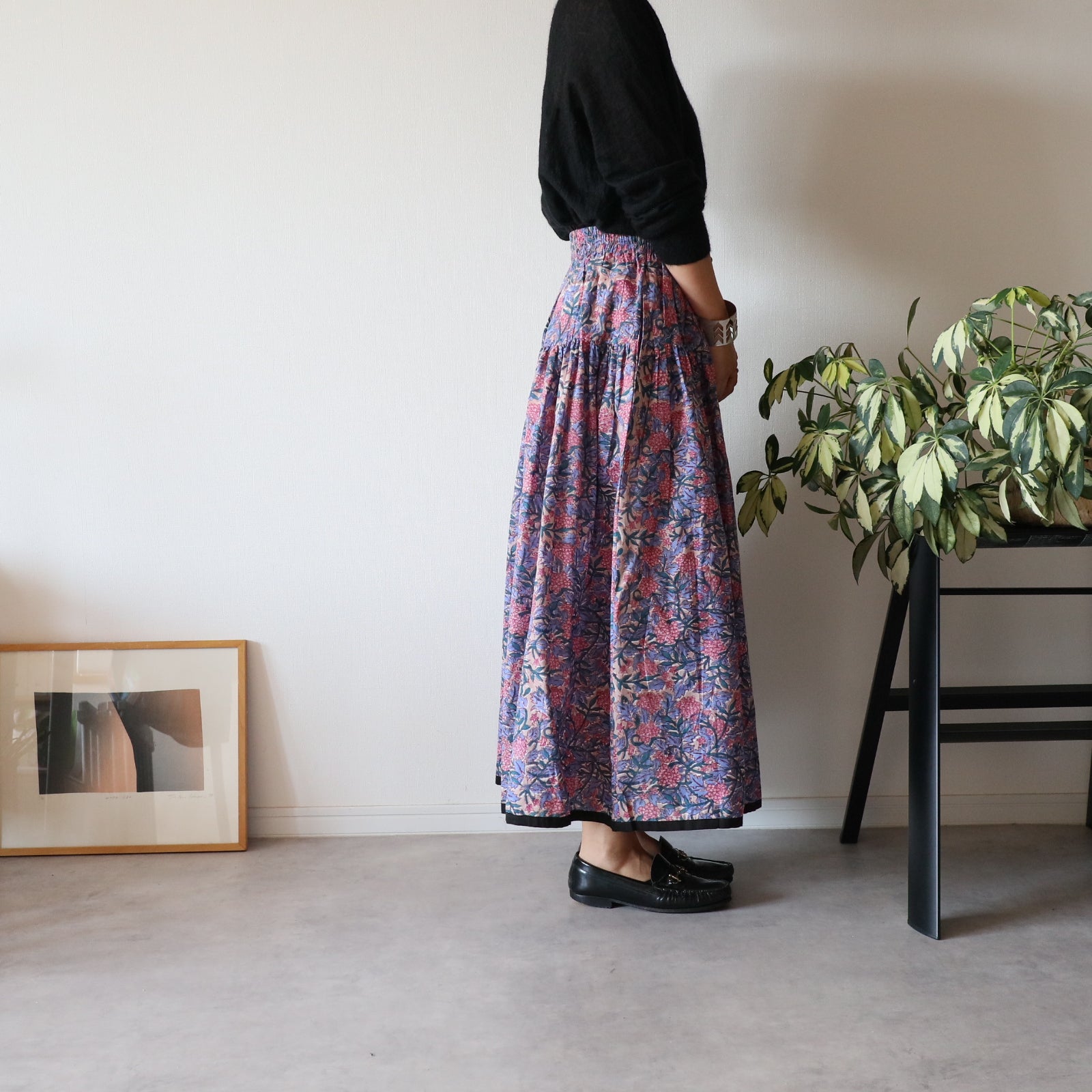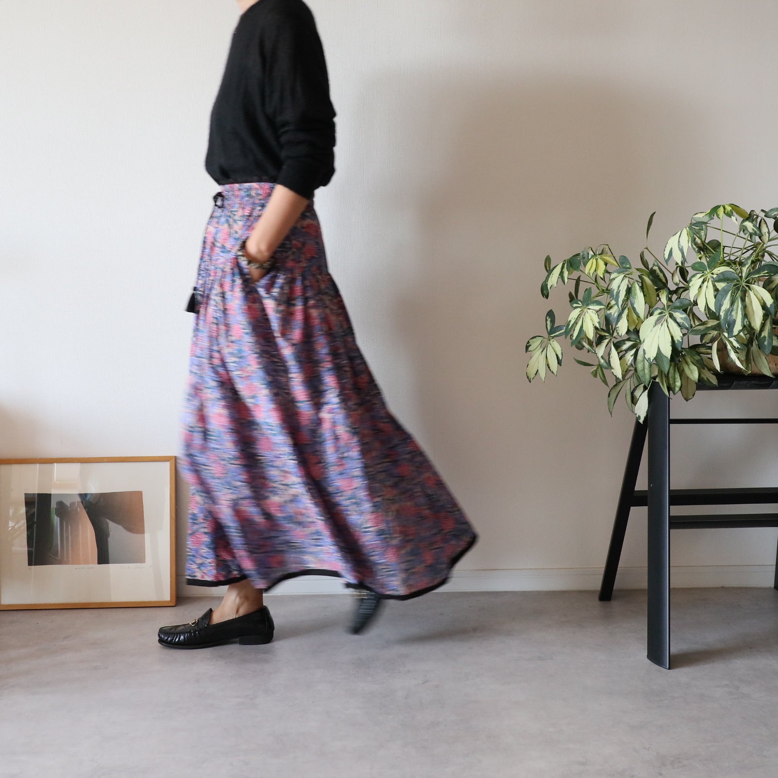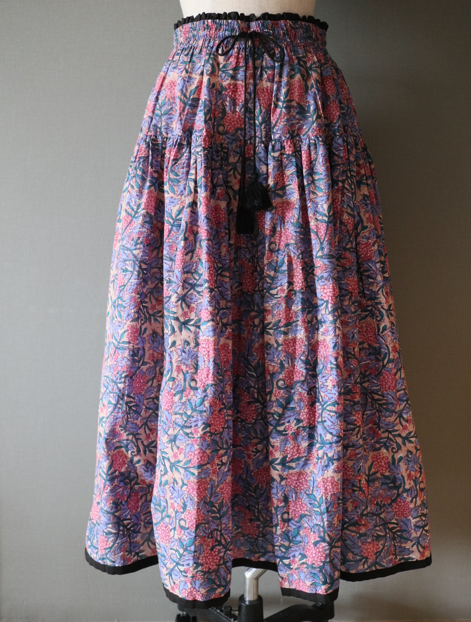 人気商品"ジャムダニスカート"のデザインはそのままにブロックプリント生地に合うよう生地量を調整し、広がり過ぎずにスッキリ。でも華やかさがある。そんなティアードスカートを作りました。