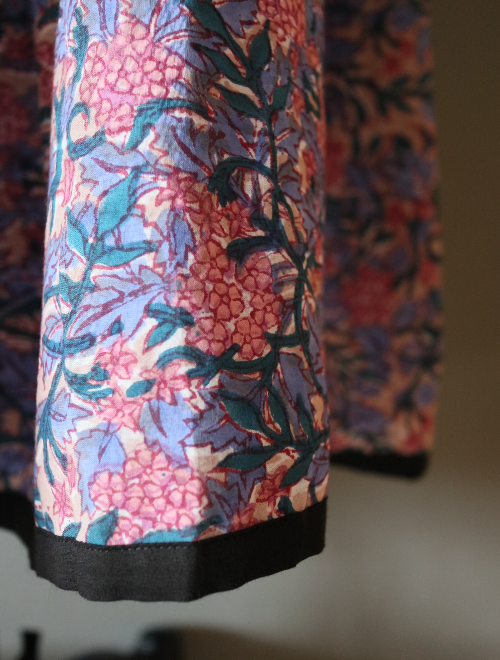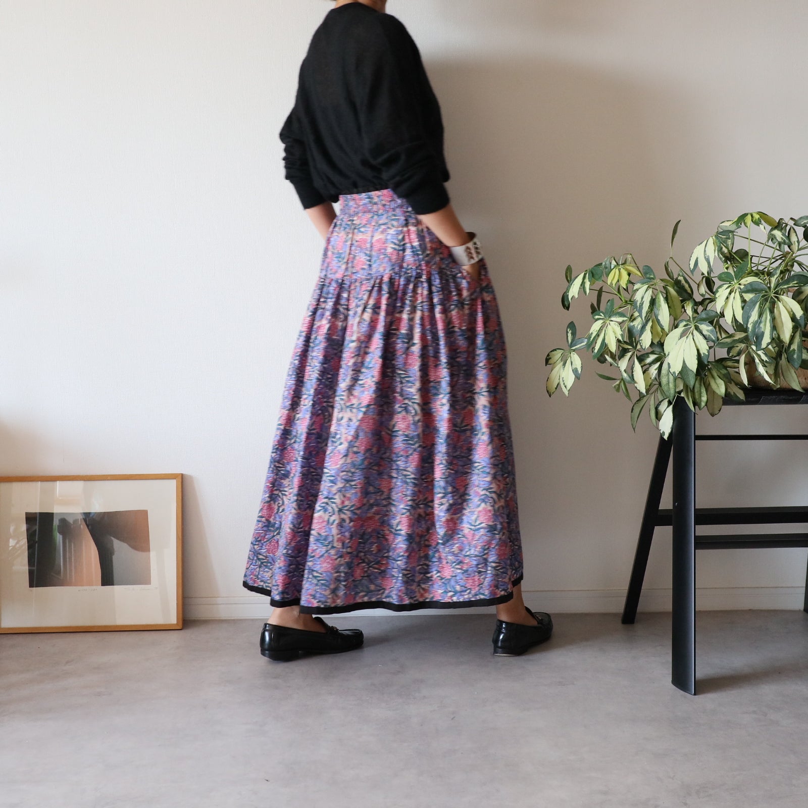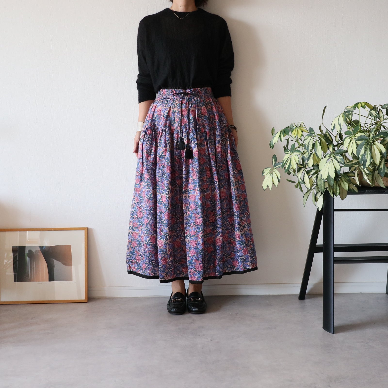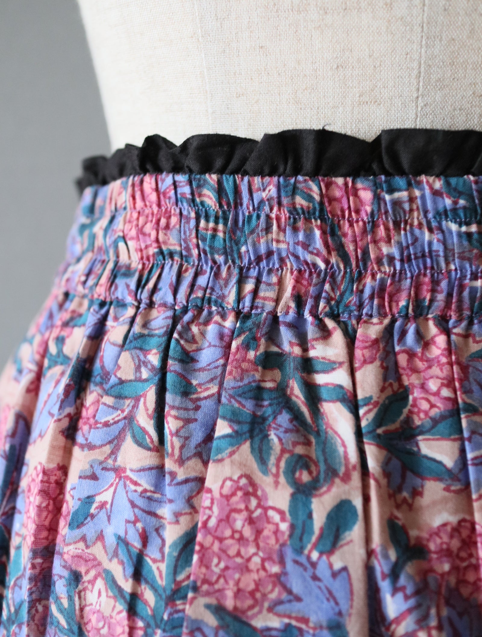 人気商品"ジャムダニスカート"のデザインはそのままにブロックプリント生地に合うよう生地量を調整し、広がり過ぎずにスッキリ。でも華やかさがある。そんなティアードスカートを作りました。