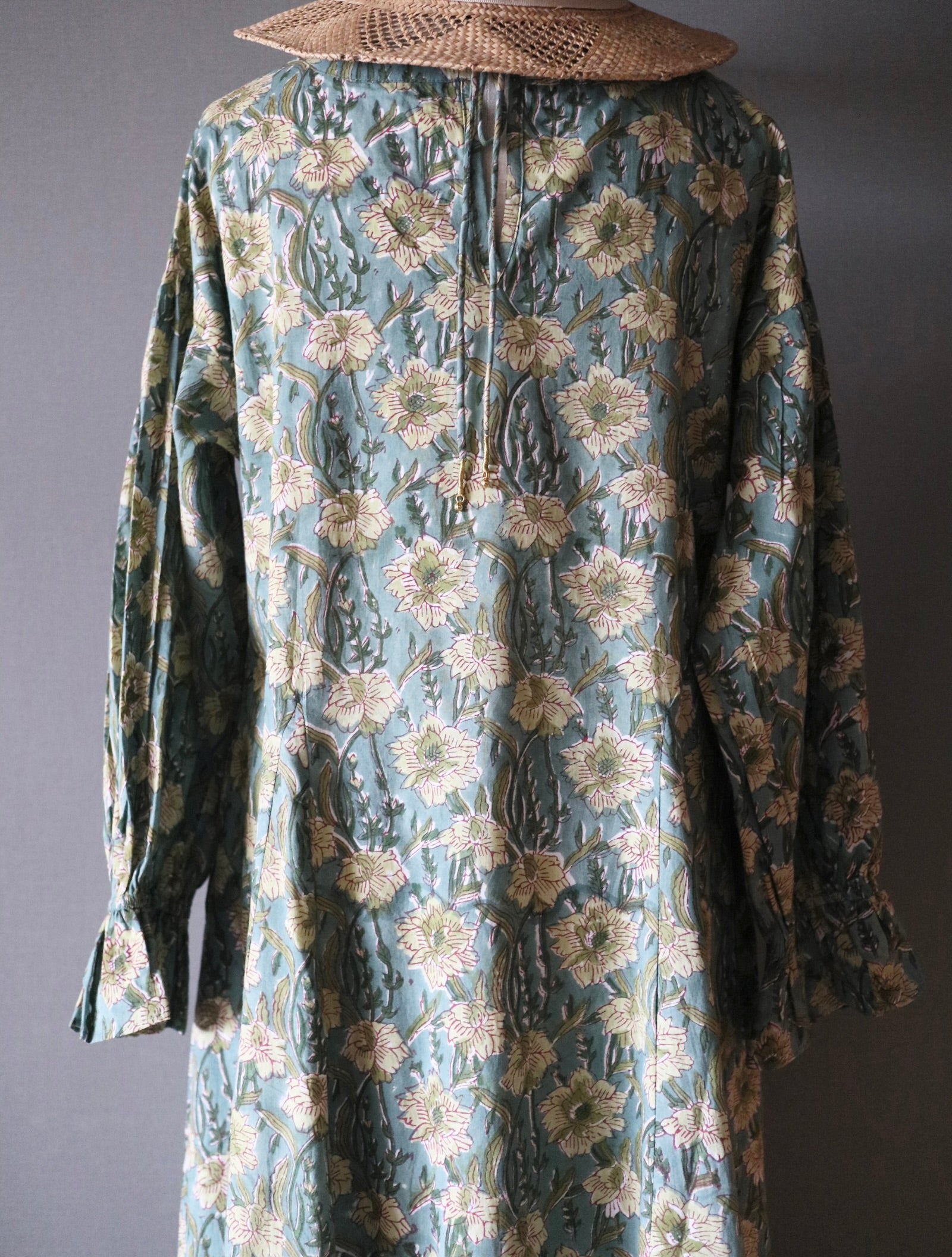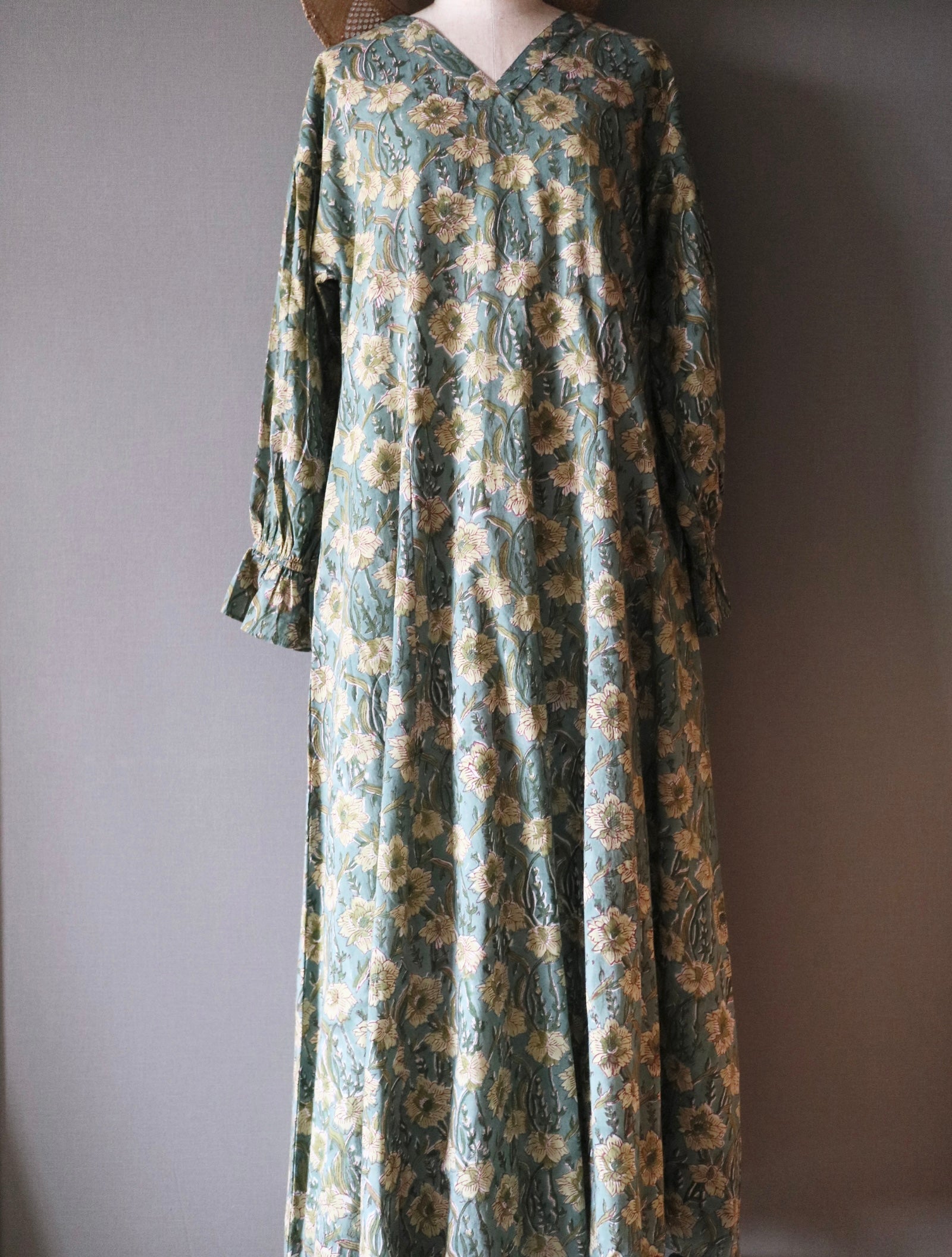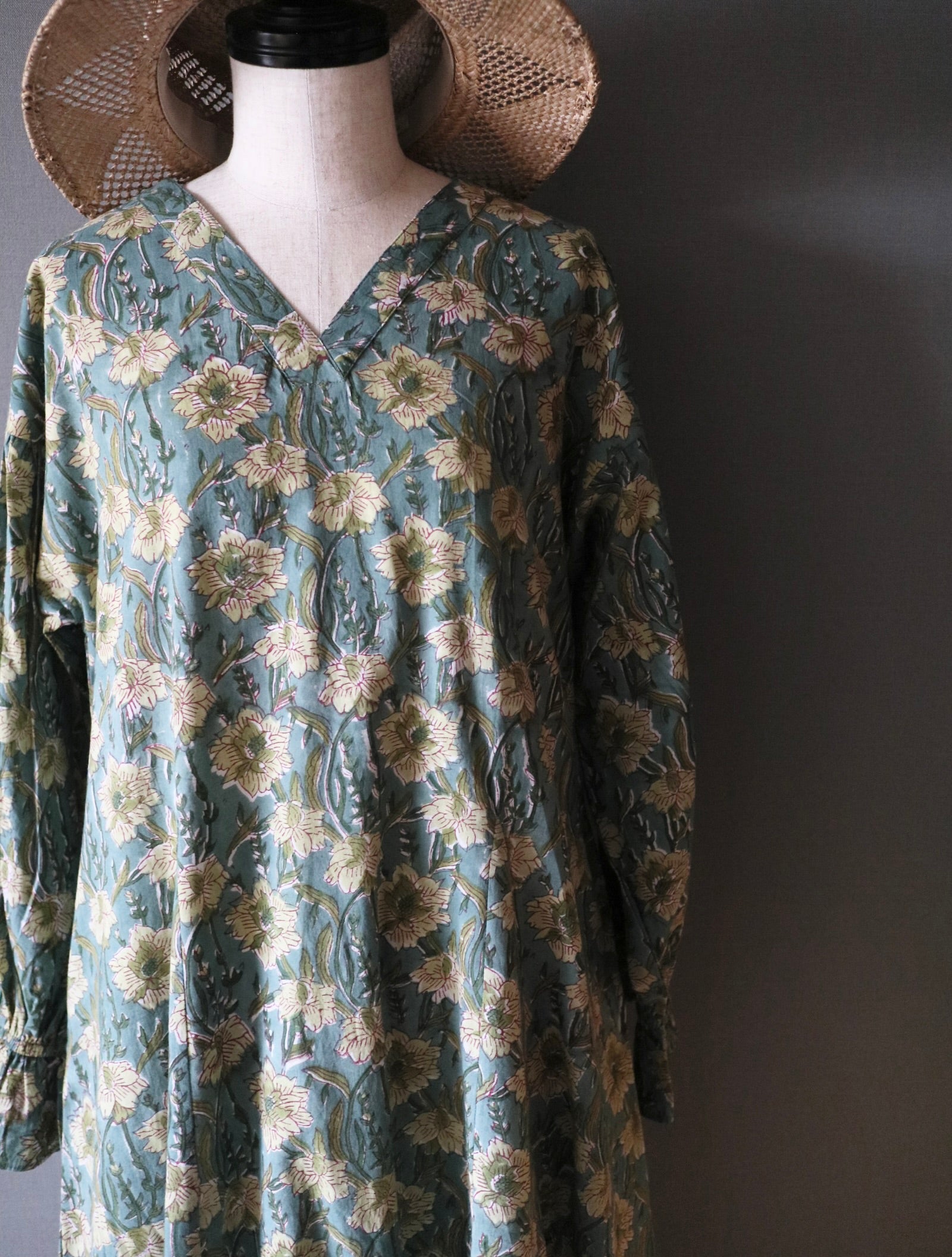 日本から遠く離れたインドの工房で一から全ての工程を一枚一枚プロの職人さんが仕立てた、ハンドブロックプリントワンピース。