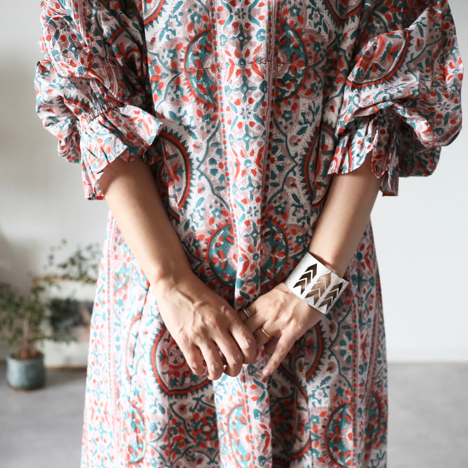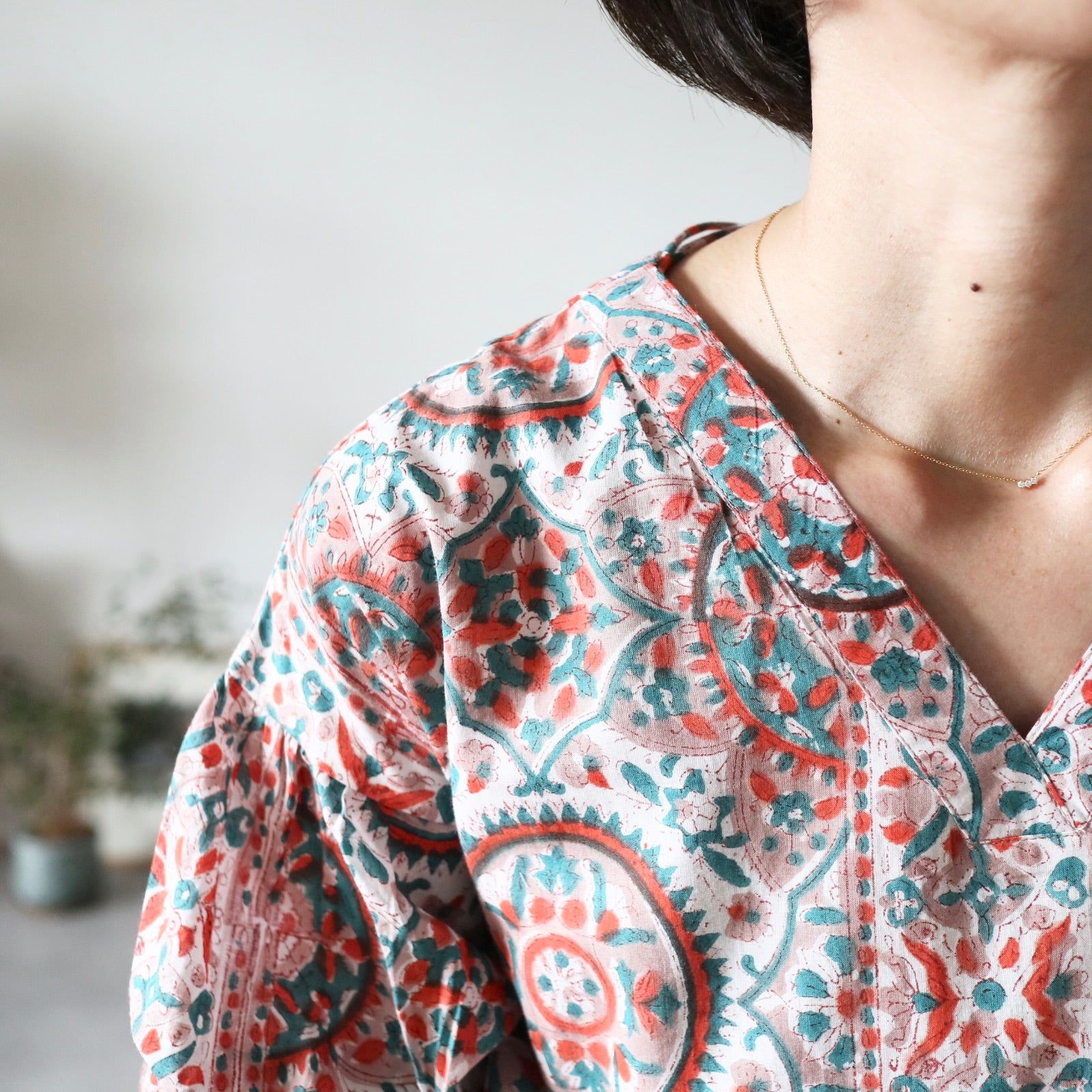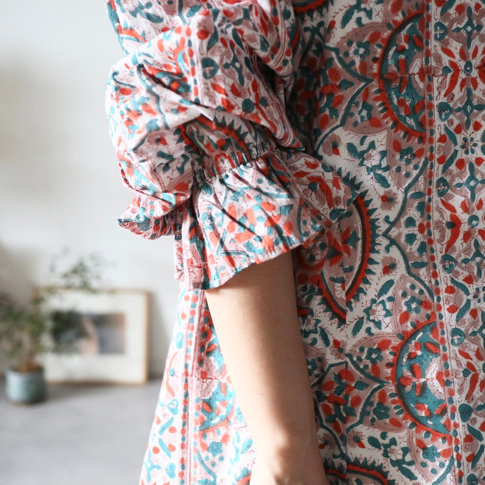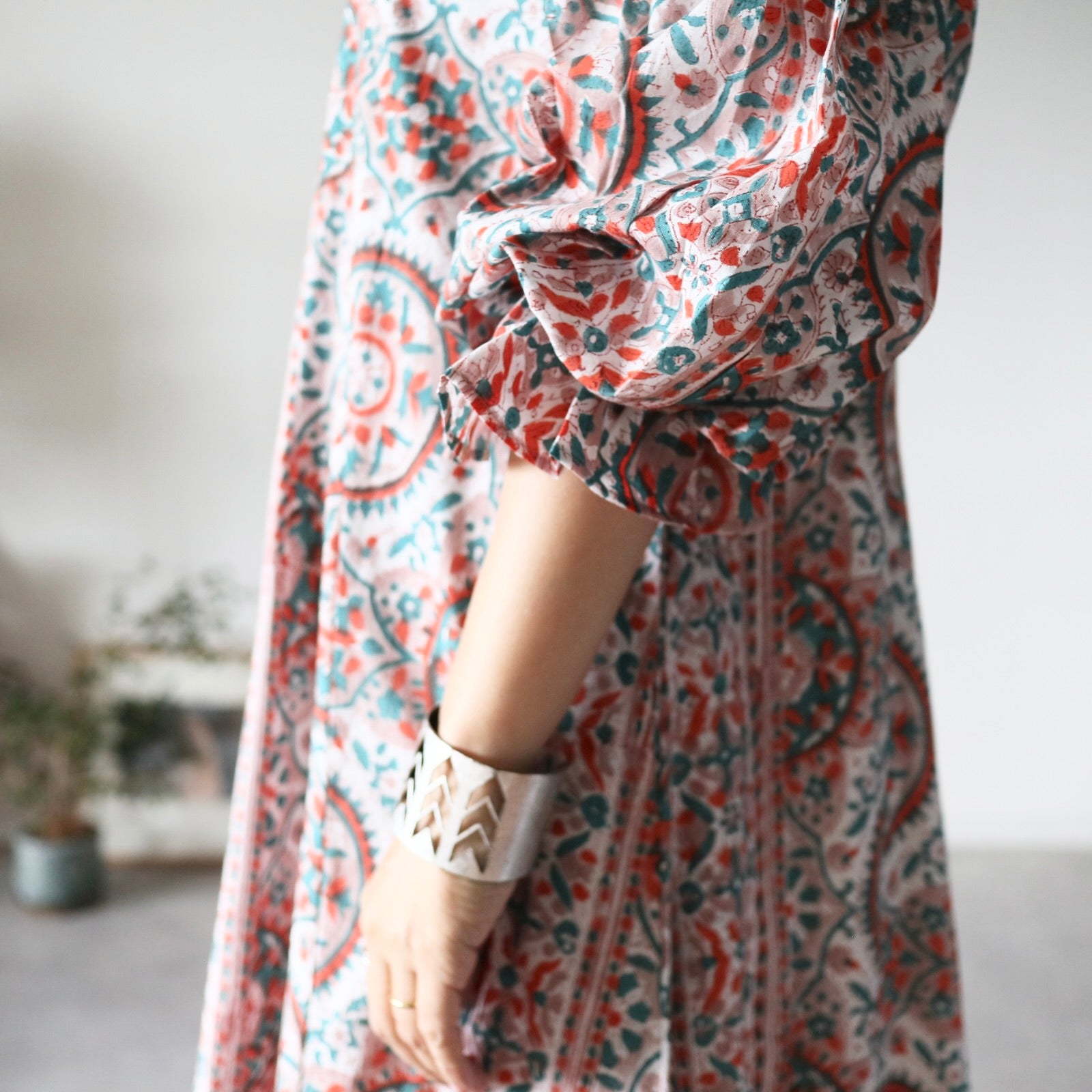 日本から遠く離れたインドの工房で一から全ての工程を一枚一枚プロの職人さんが仕立てた、ハンドブロックプリントワンピース。