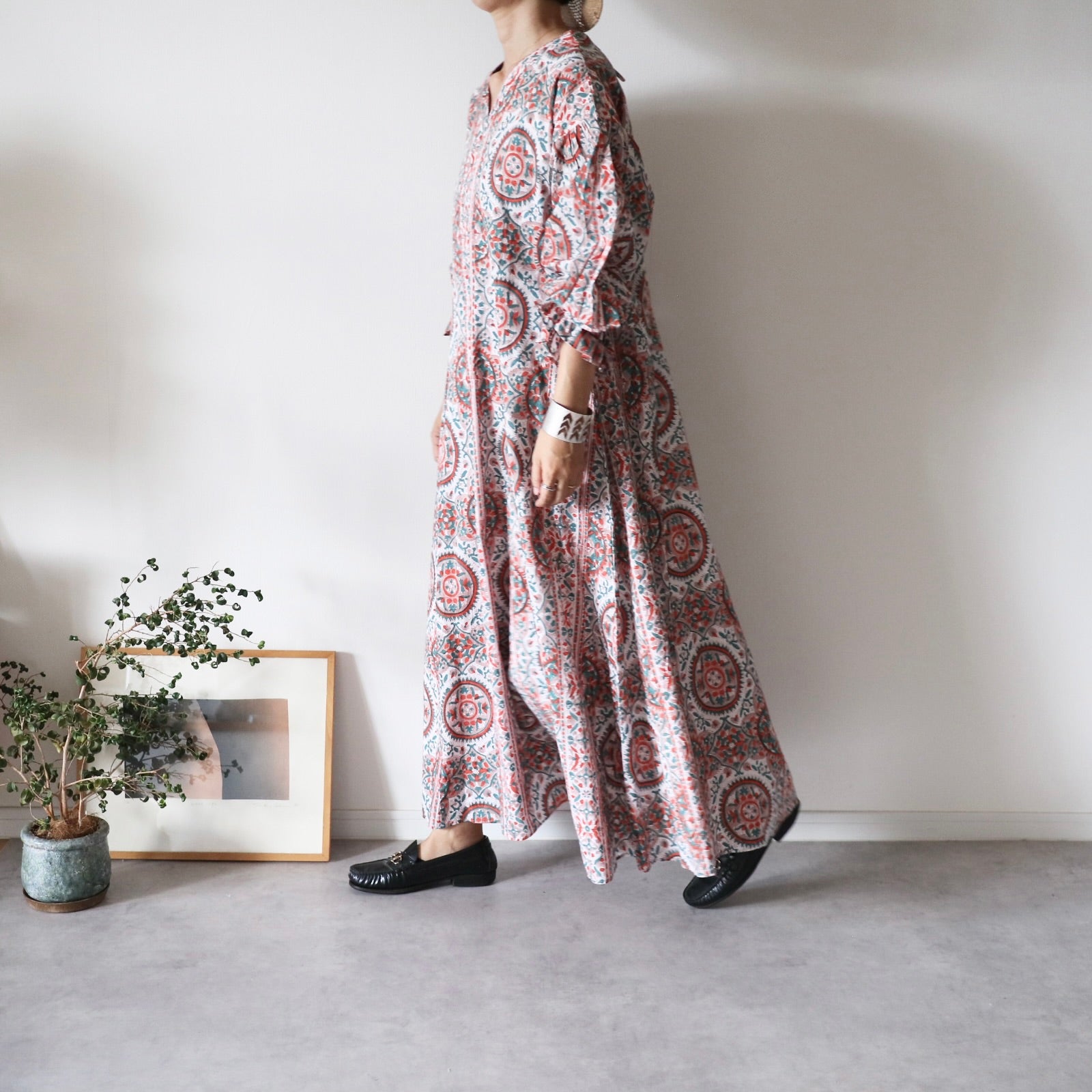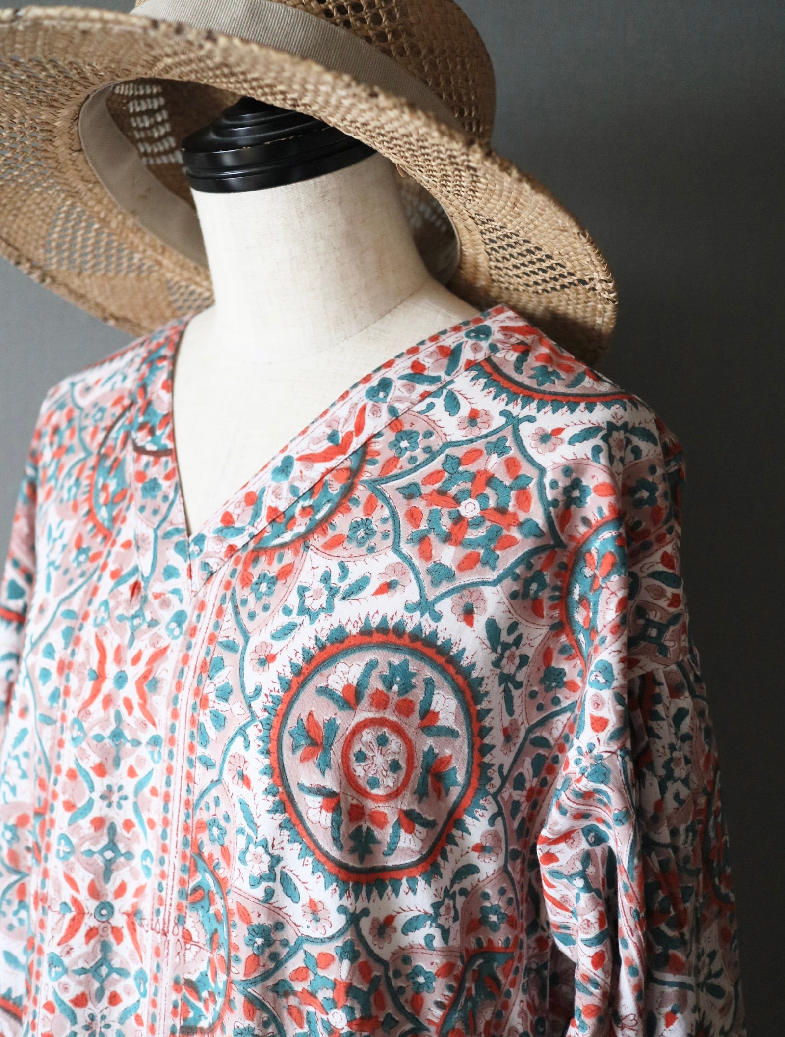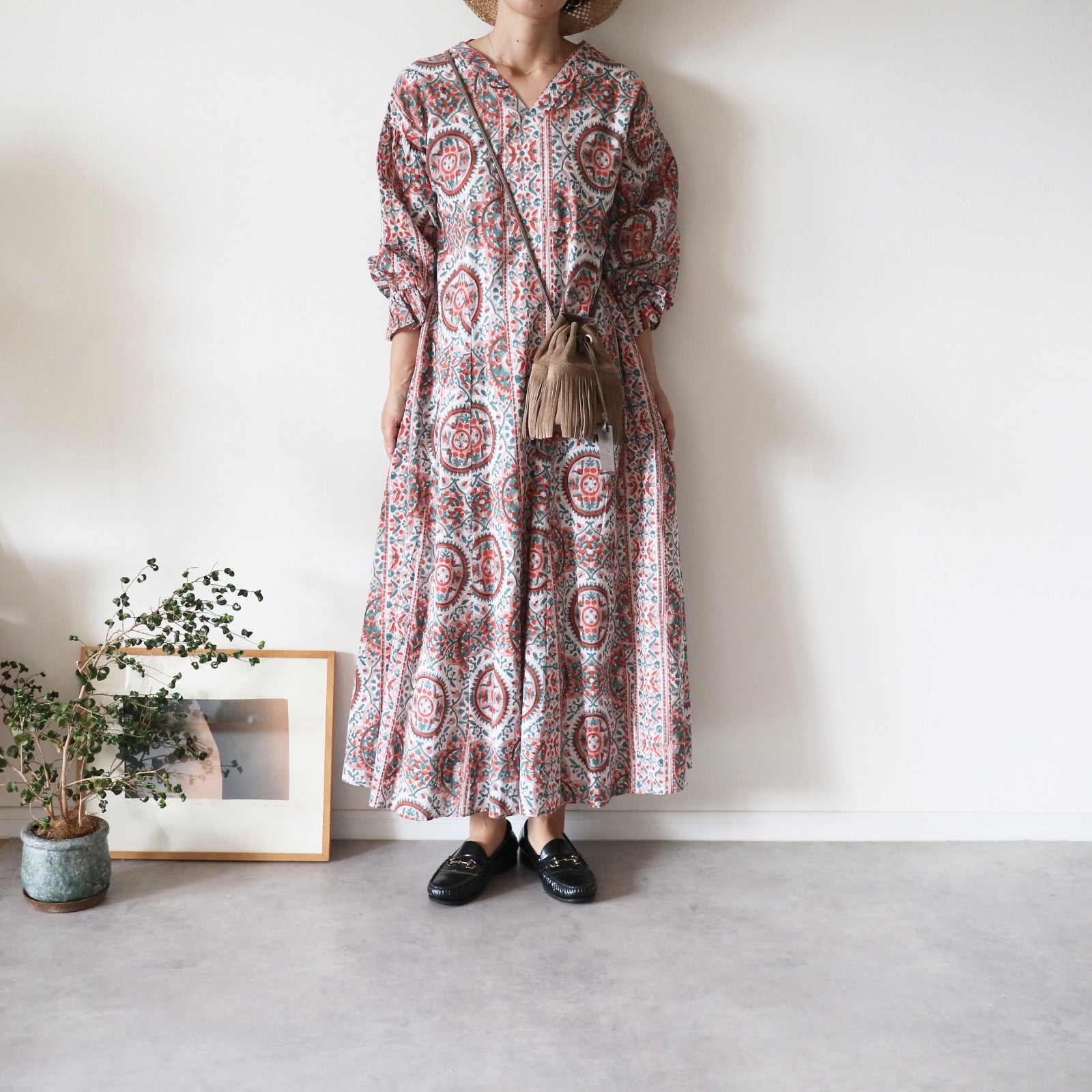 日本から遠く離れたインドの工房で一から全ての工程を一枚一枚プロの職人さんが仕立てた、ハンドブロックプリントワンピース。