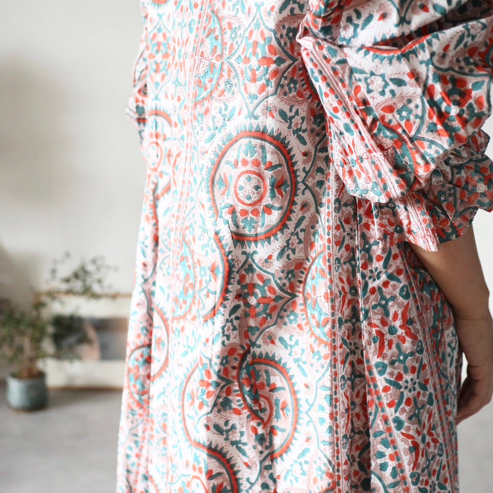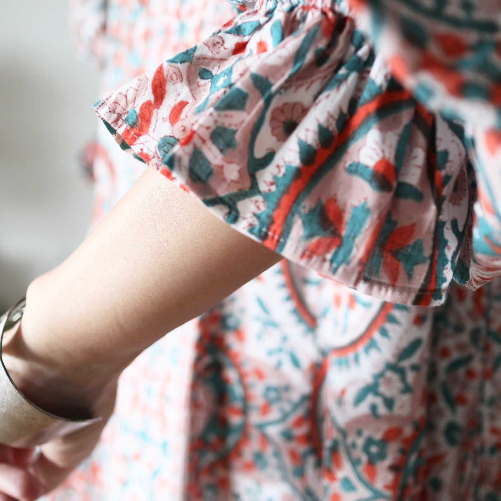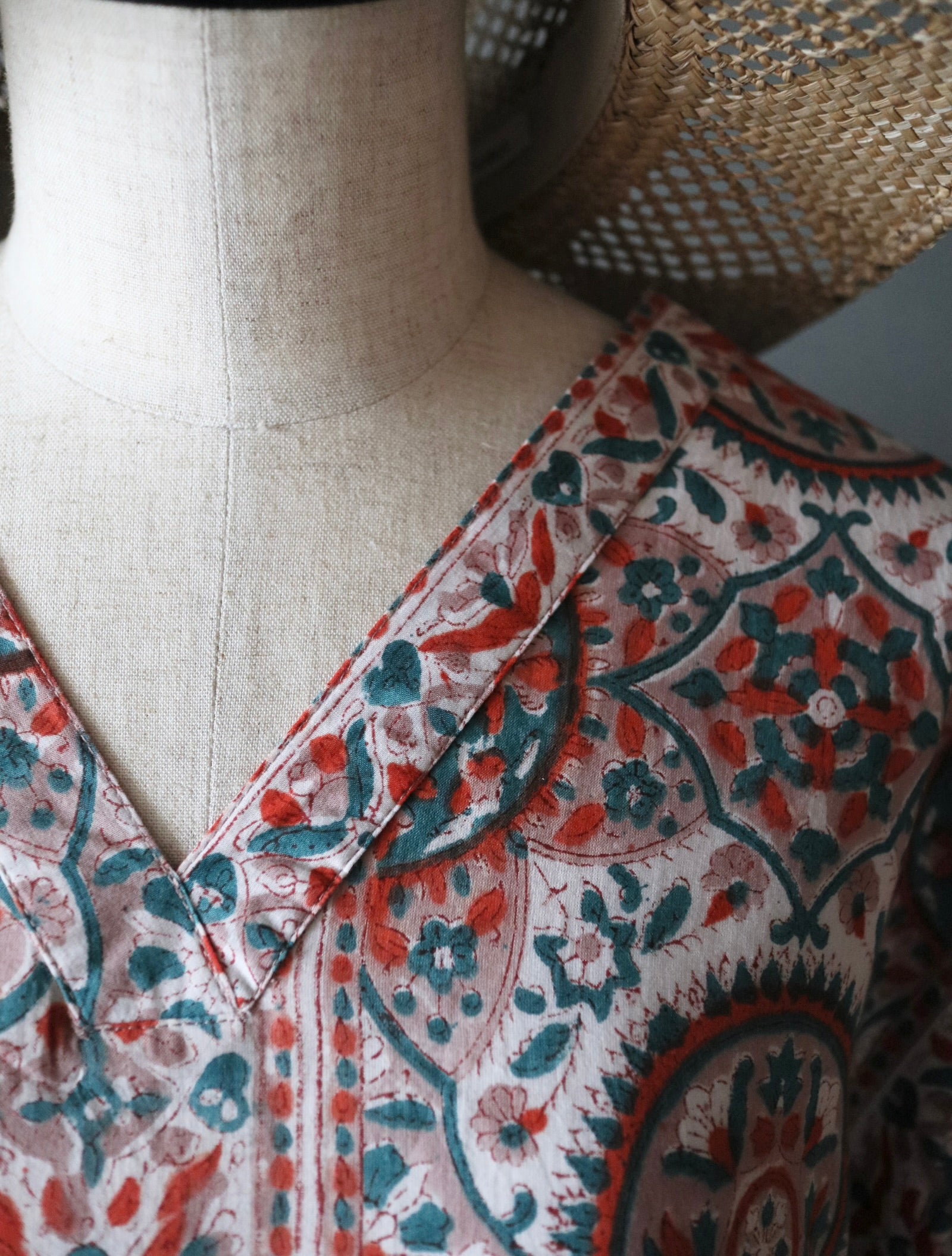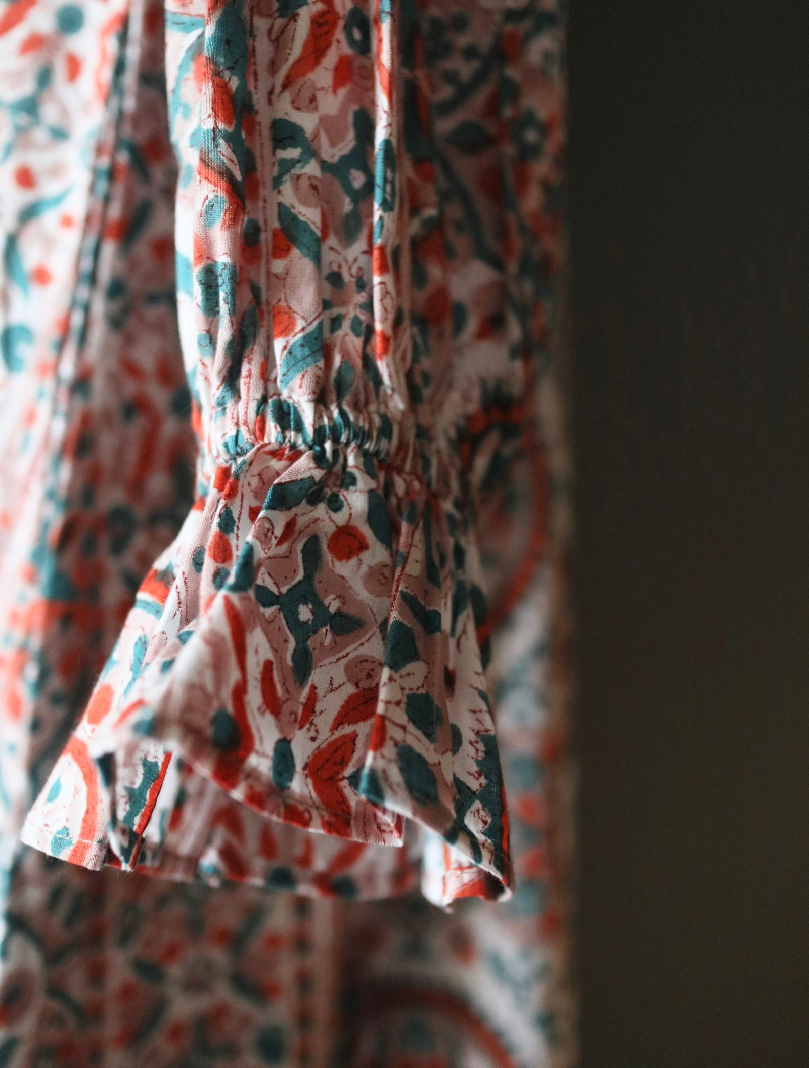 日本から遠く離れたインドの工房で一から全ての工程を一枚一枚プロの職人さんが仕立てた、ハンドブロックプリントワンピース。