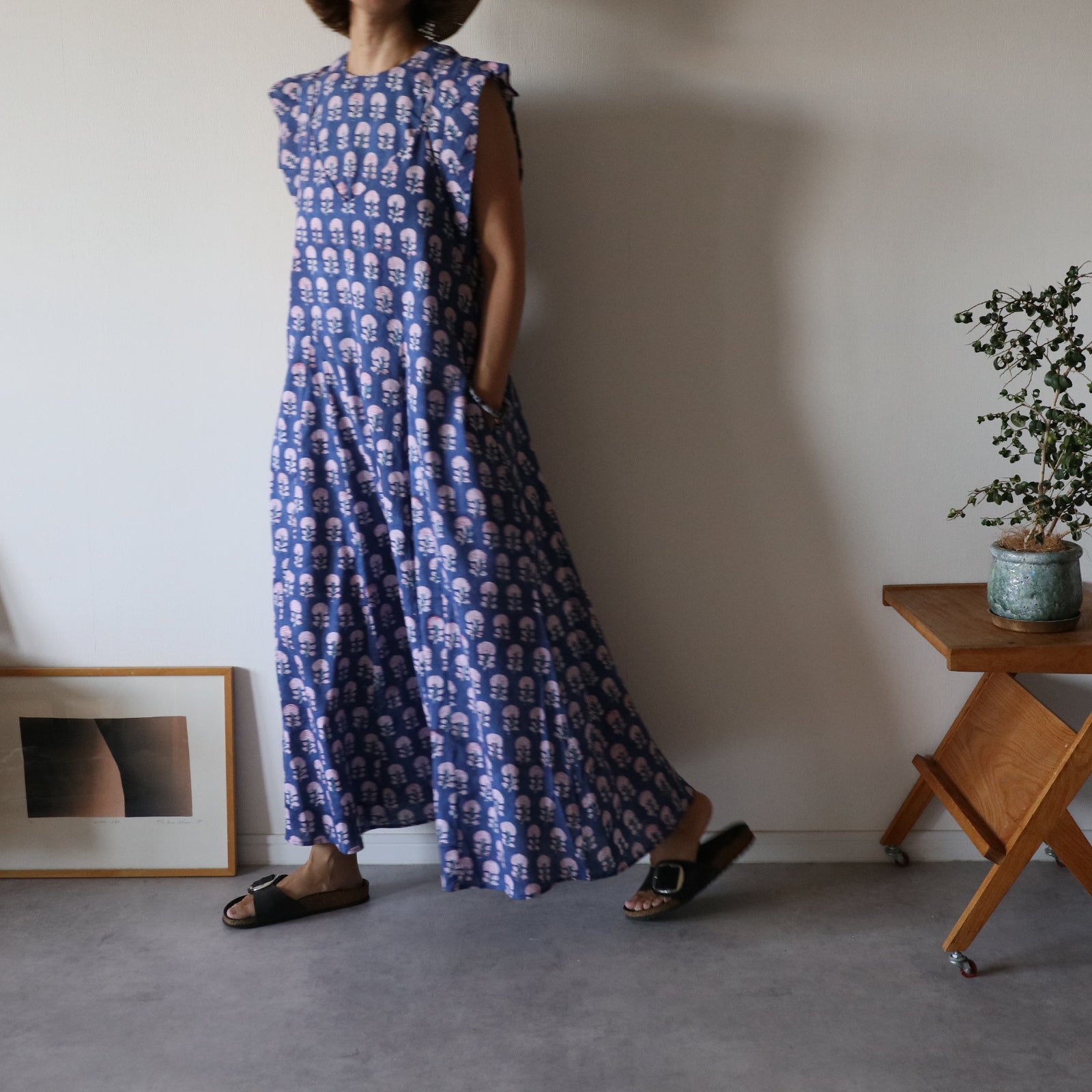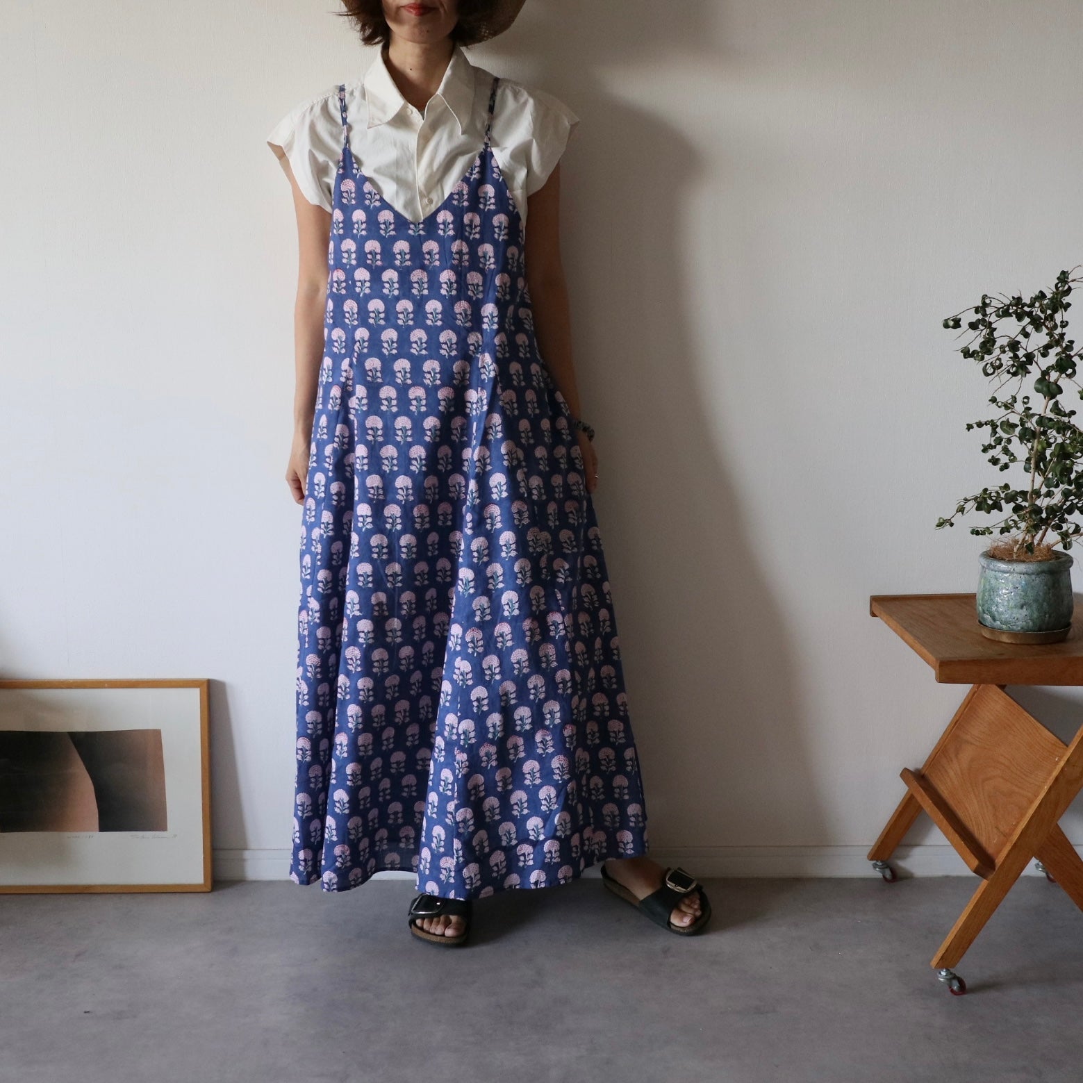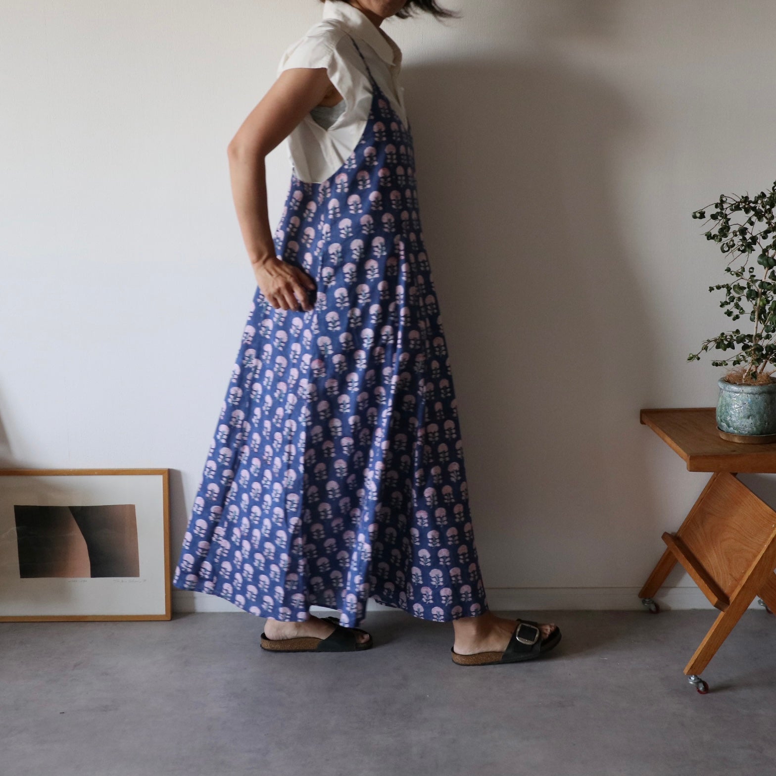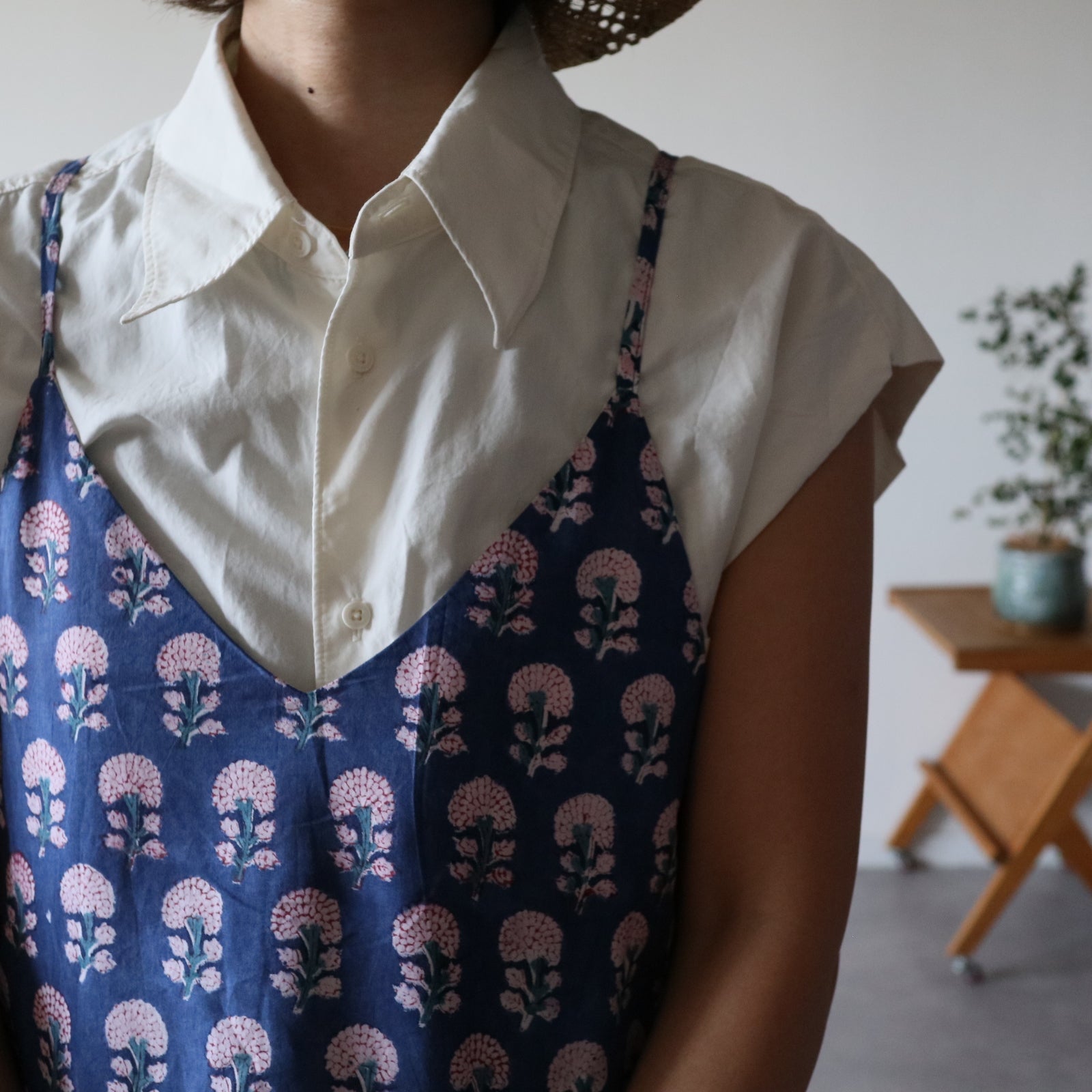 繊細なインドのブロックプリントで仕立てた、心地よさと華やかさを両立するキャミソールワンピース。上半身スッキリ、スカートは広がり過ぎないフレアタイプ。