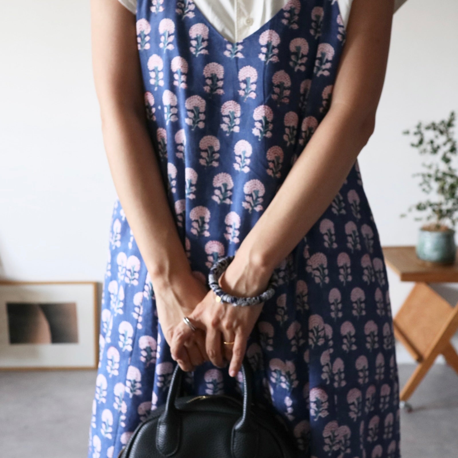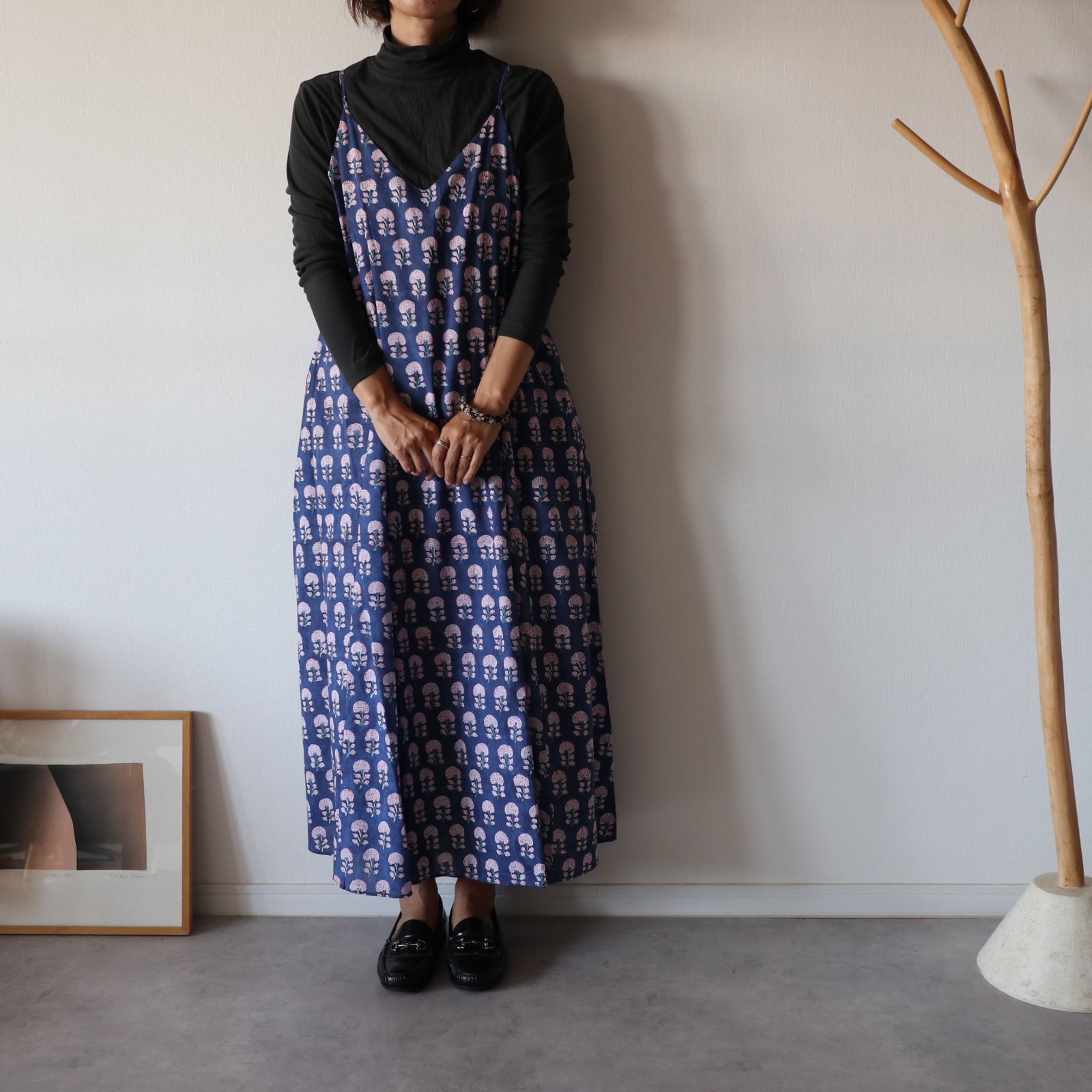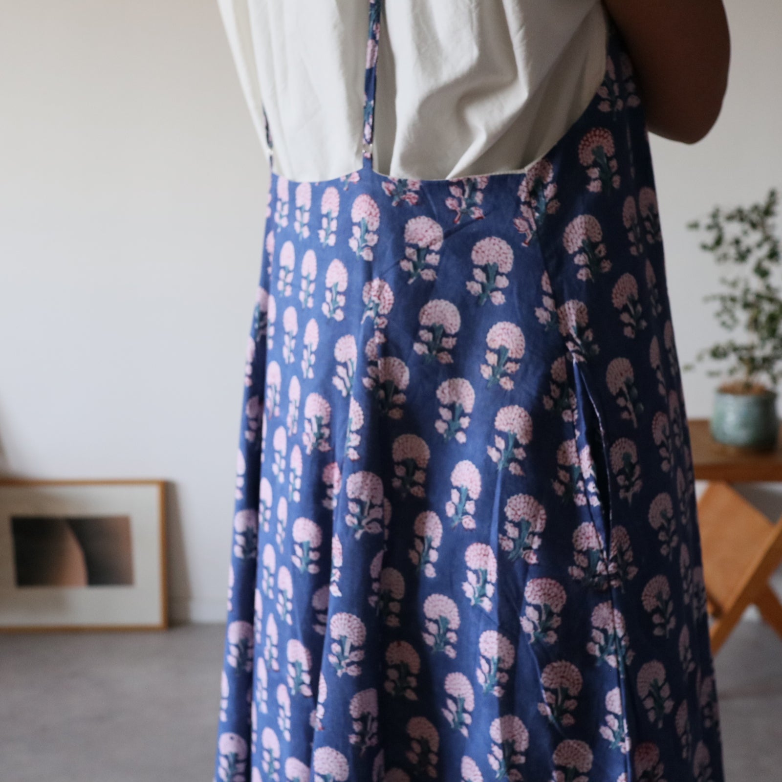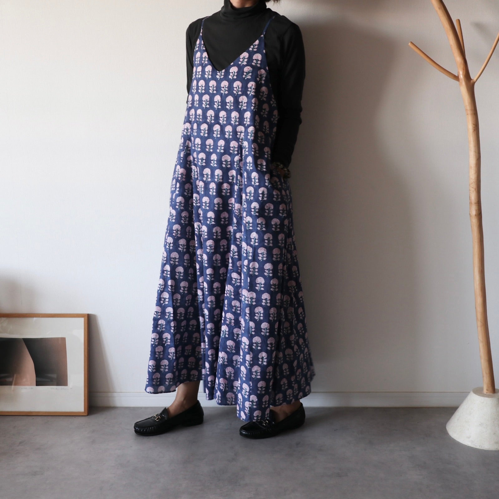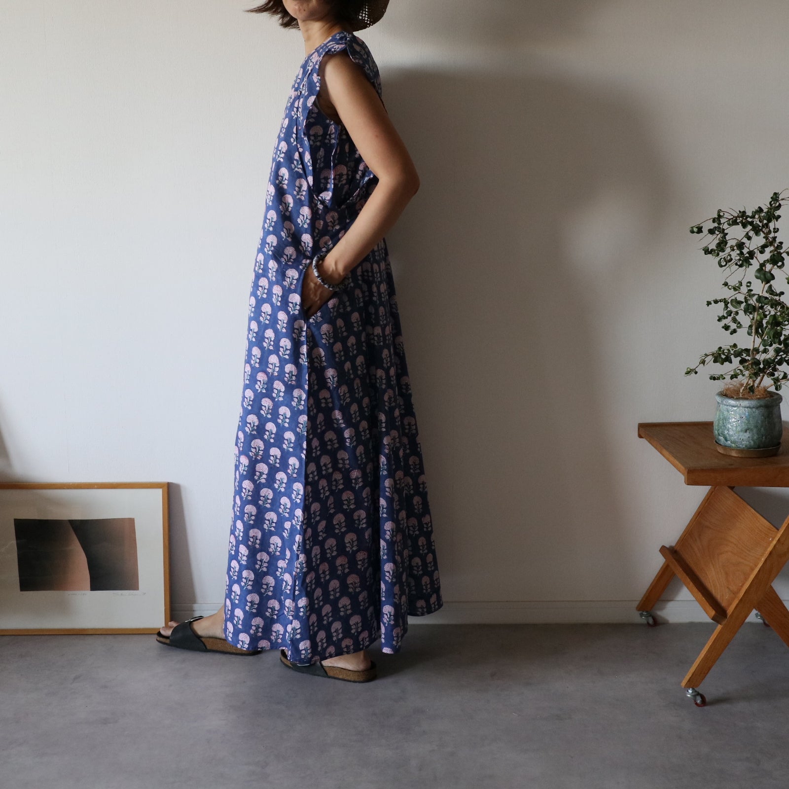繊細なインドのブロックプリントで仕立てた、心地よさと華やかさを両立するキャミソールワンピース。上半身スッキリ、スカートは広がり過ぎないフレアタイプ。