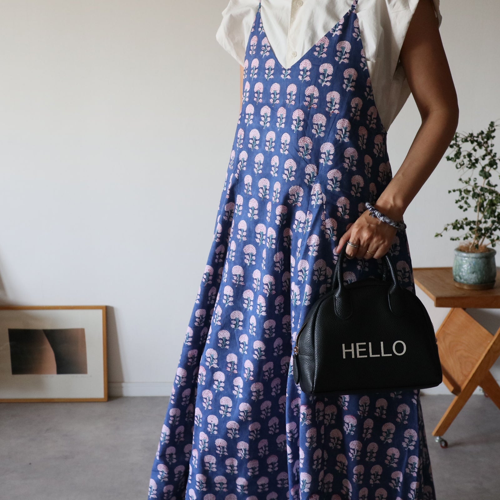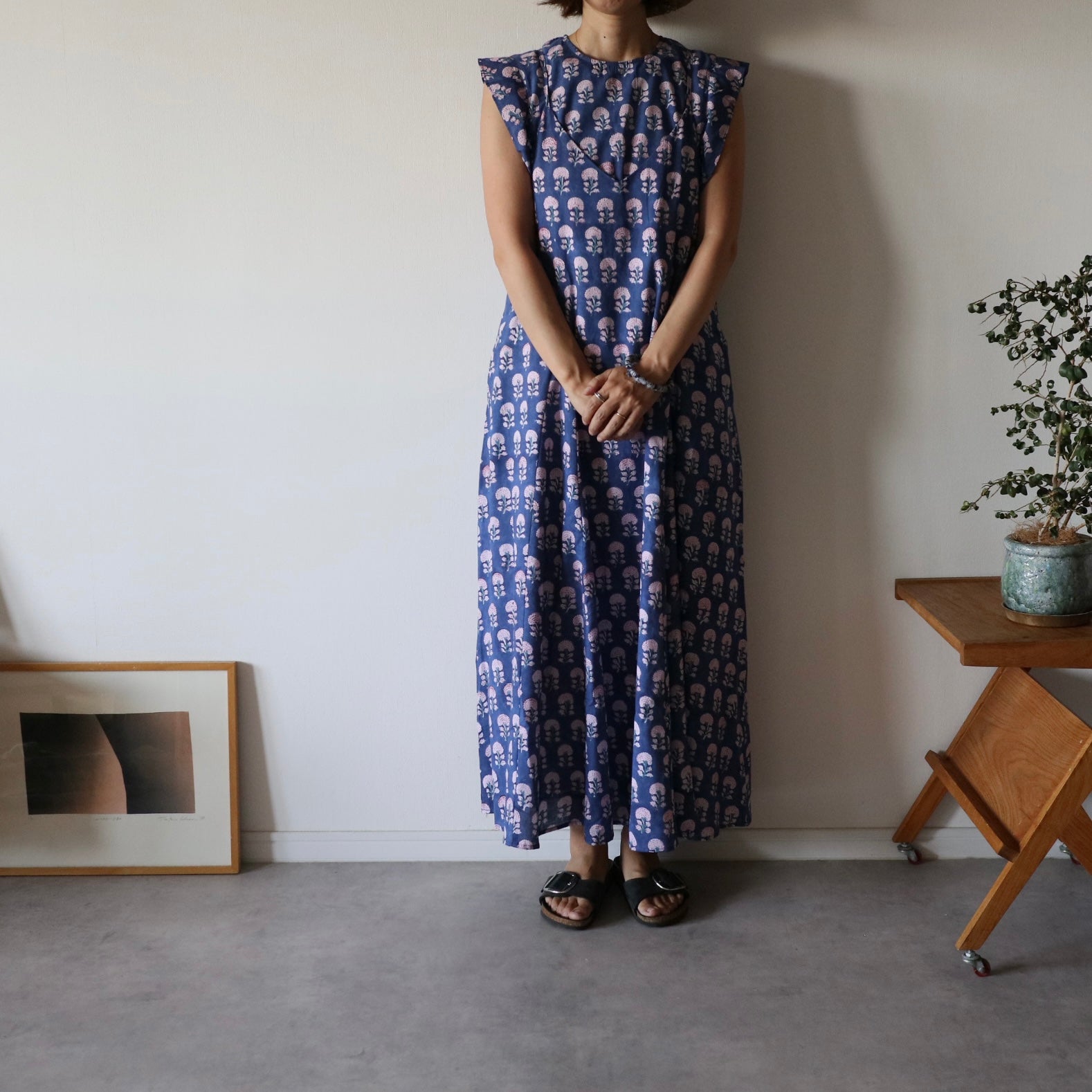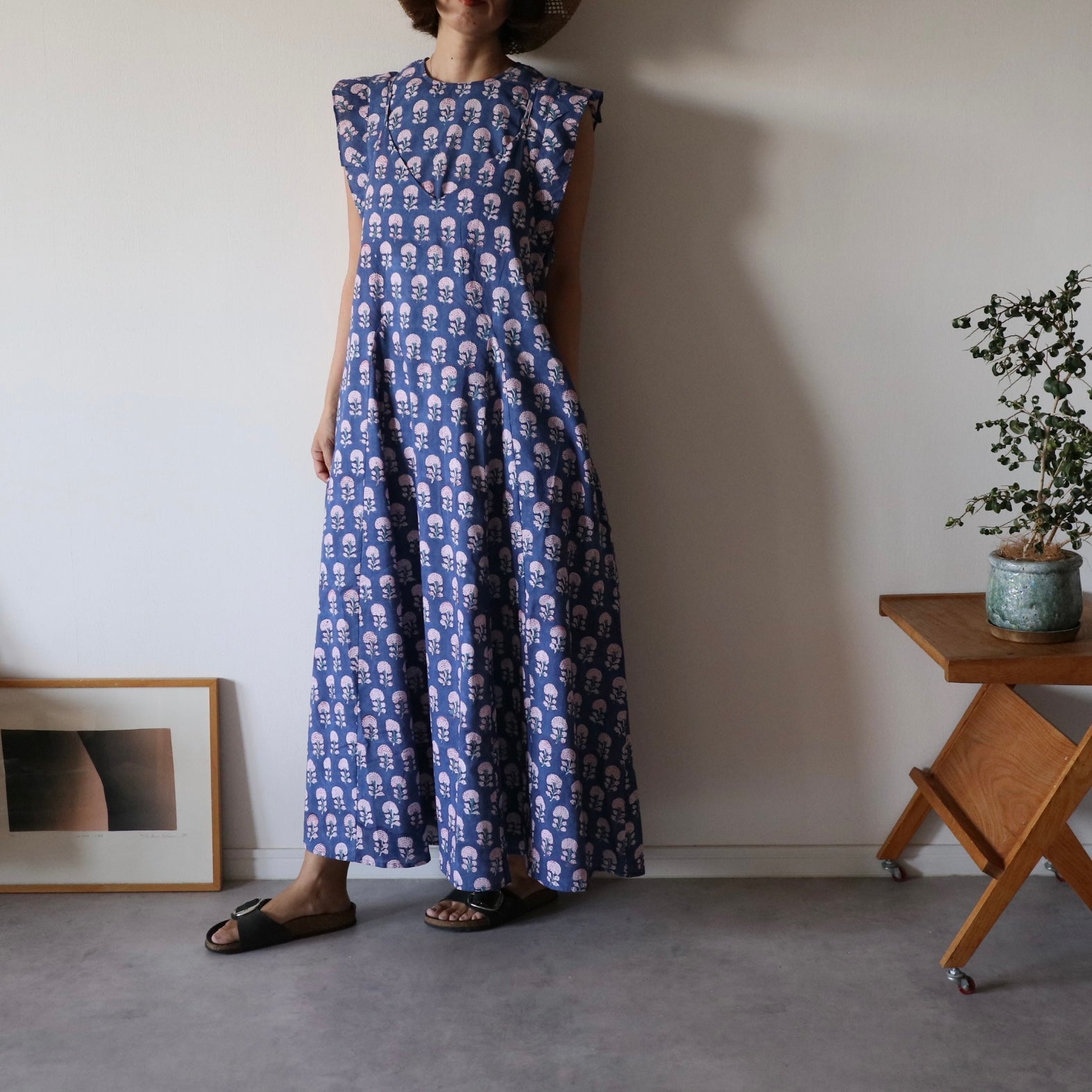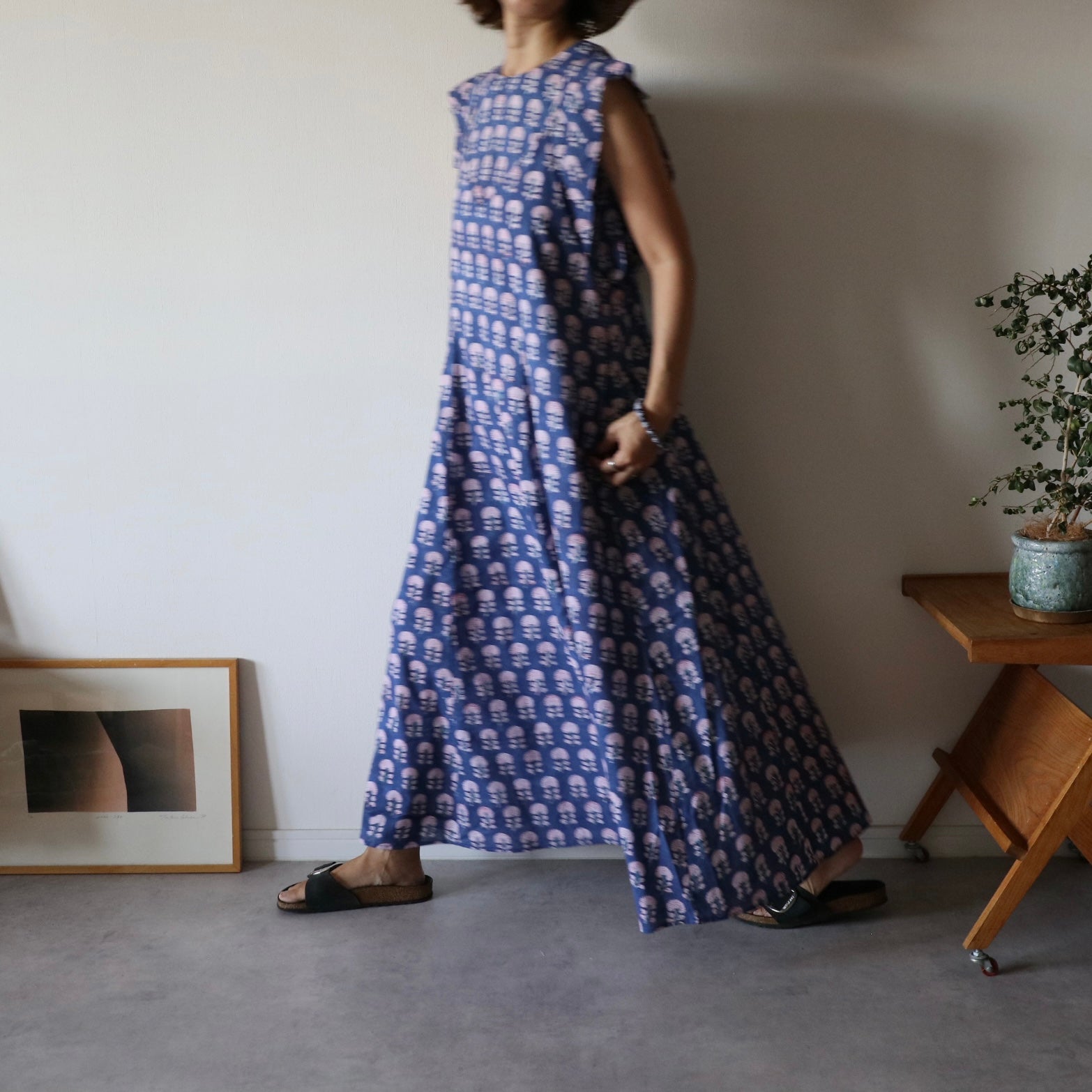 繊細なインドのブロックプリントで仕立てた、心地よさと華やかさを両立するキャミソールワンピース。上半身スッキリ、スカートは広がり過ぎないフレアタイプ。